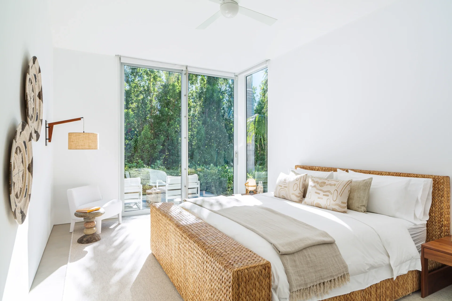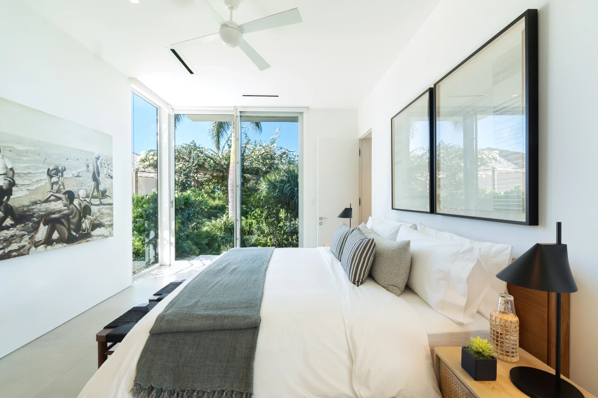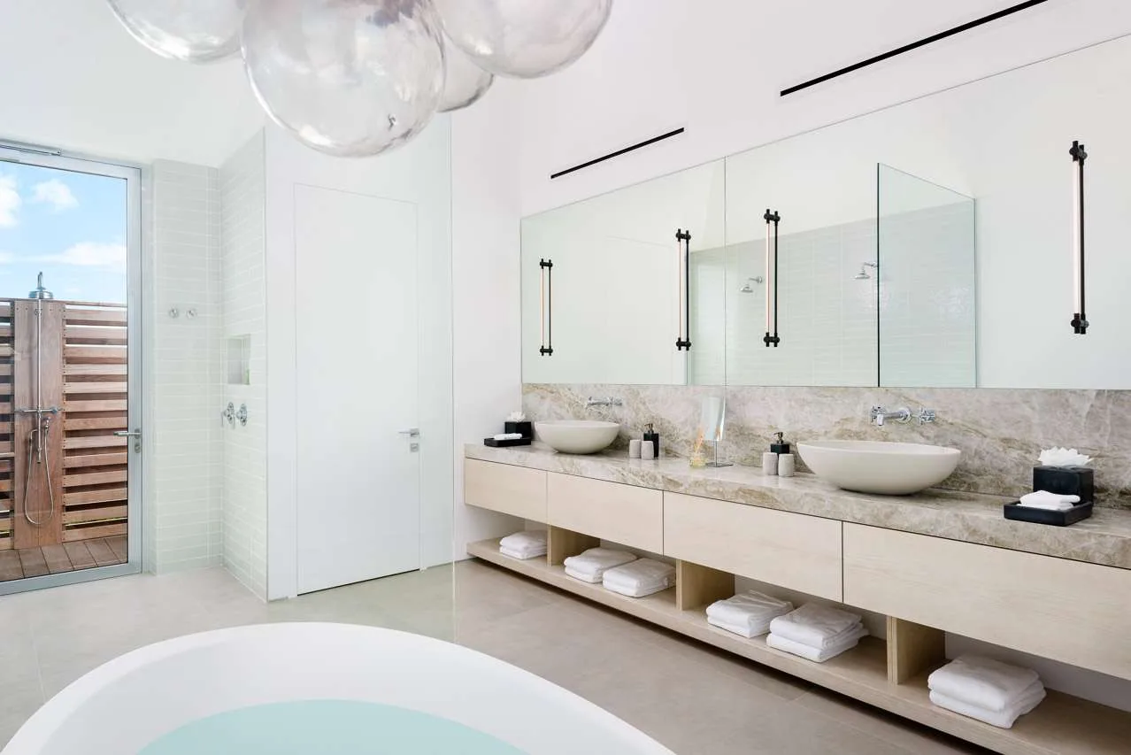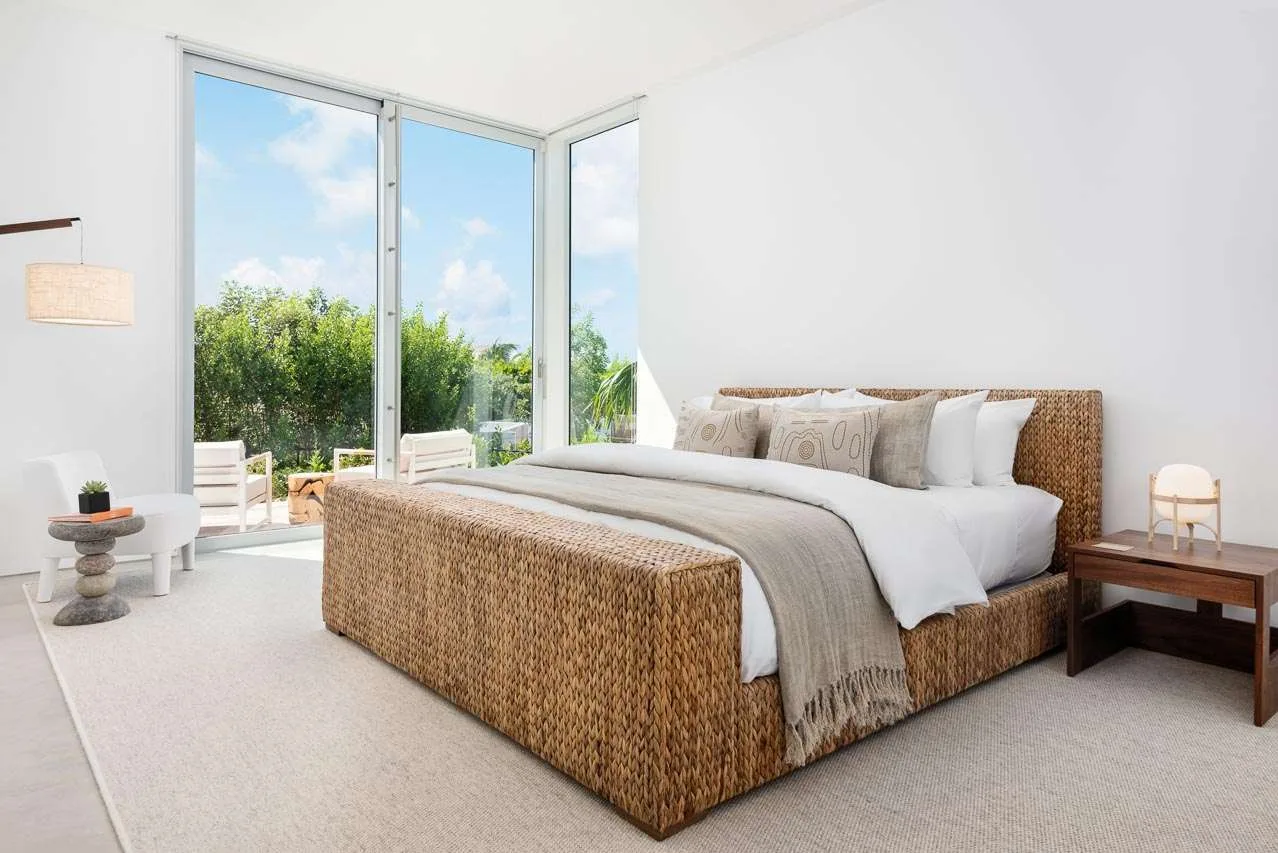 Outside, verdant grass lawns and swaying palm trees frame an infinity edge pool that spills onto a secluded beach replete with private dock.