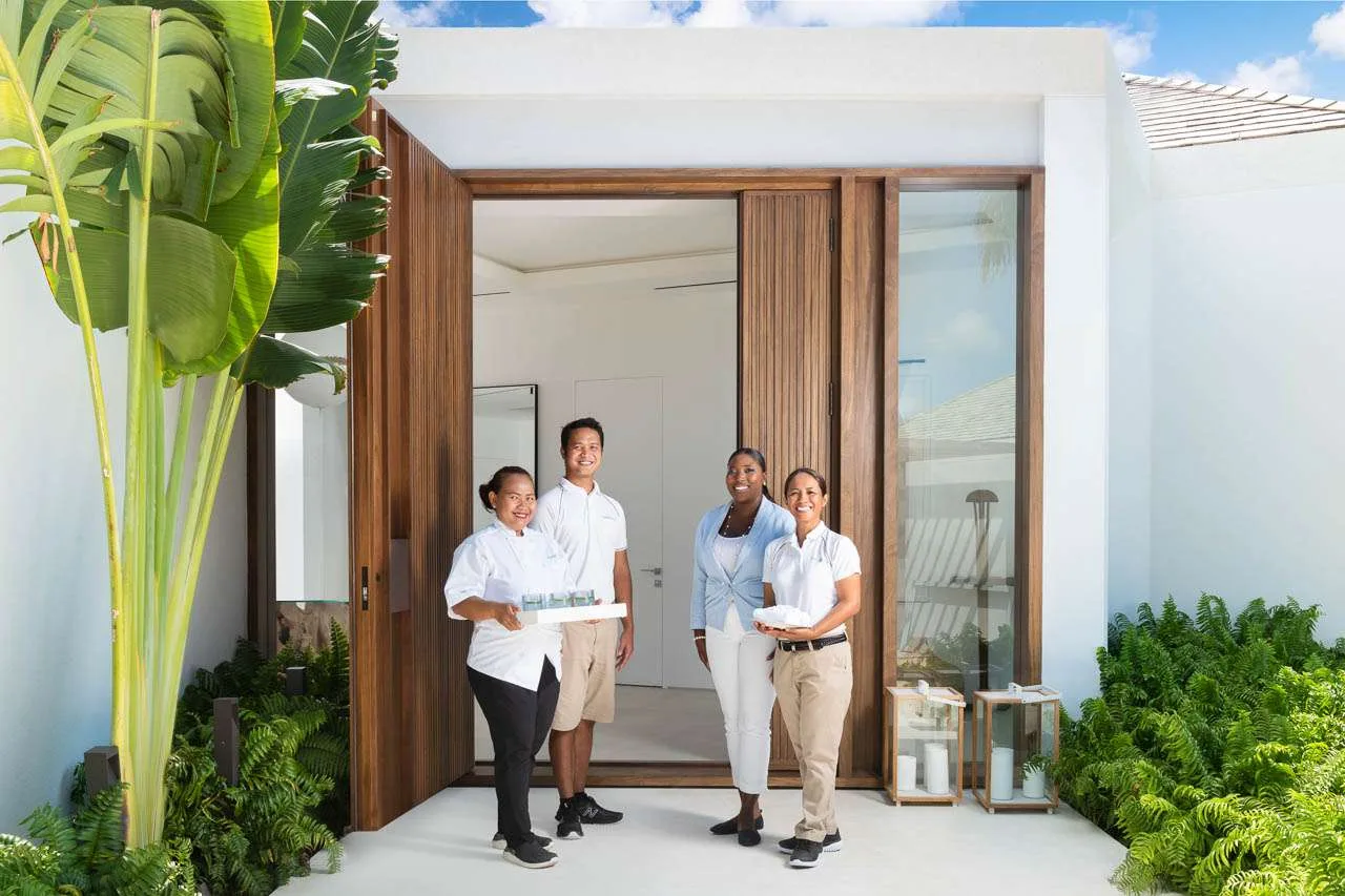 All bedrooms have ensuite bathrooms, a selection of bathroom amenities, air-conditioning and complimentary Wi-Fi access. The two master bedrooms offer stunning views over beach and water, alfresco rain showers, dual vanities and much more. The kids in the group will enjoy their own room with two twin-size bunk beds. And a couple wanting more privacy can take a separate bedroom in a guest house, with its own kitchenette.