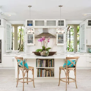 Freshly renovated living spaces are comfortable, lavish, and relaxing. White-washed walls reflect a bounty of natural light flowing in through French doors and shuttered windows. Splashes of colorful artwork, cushions, and decor help bring each space to life.