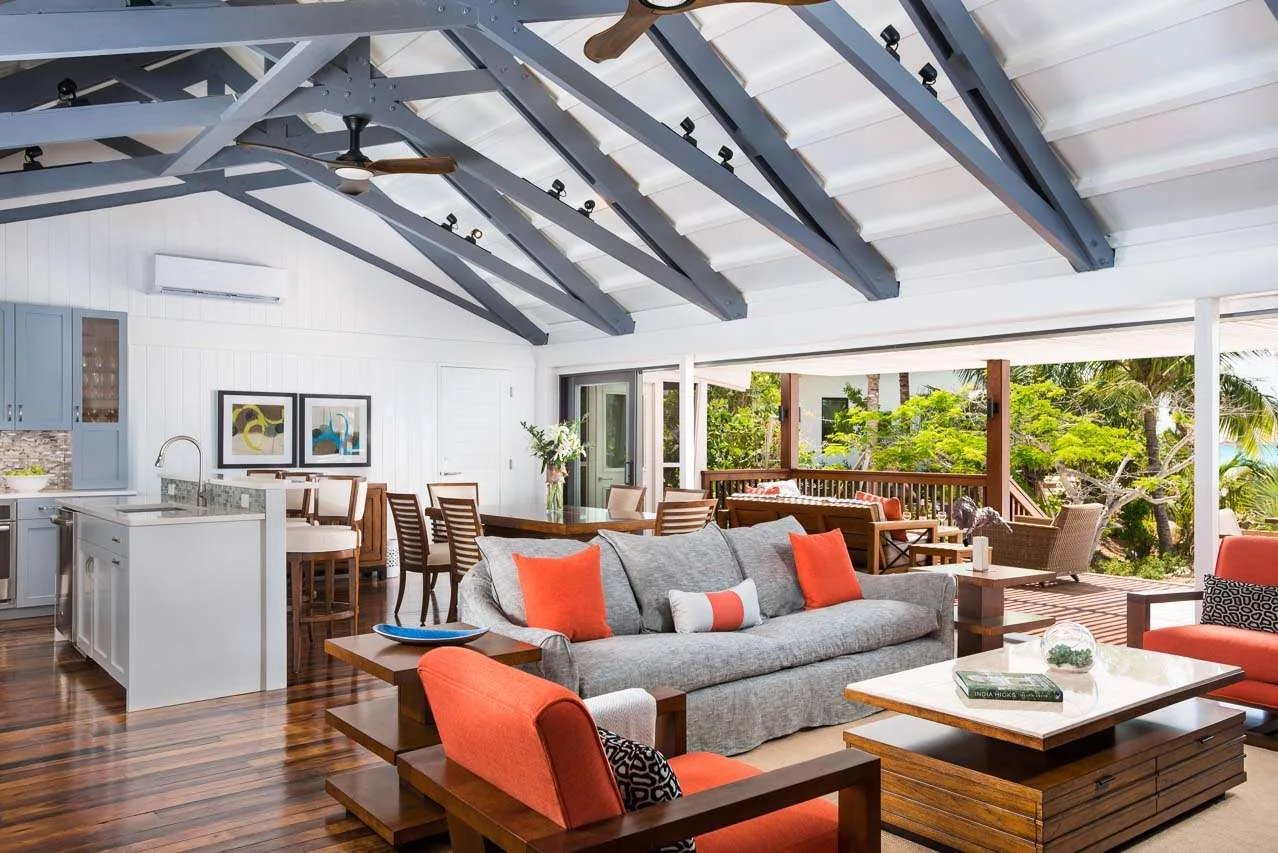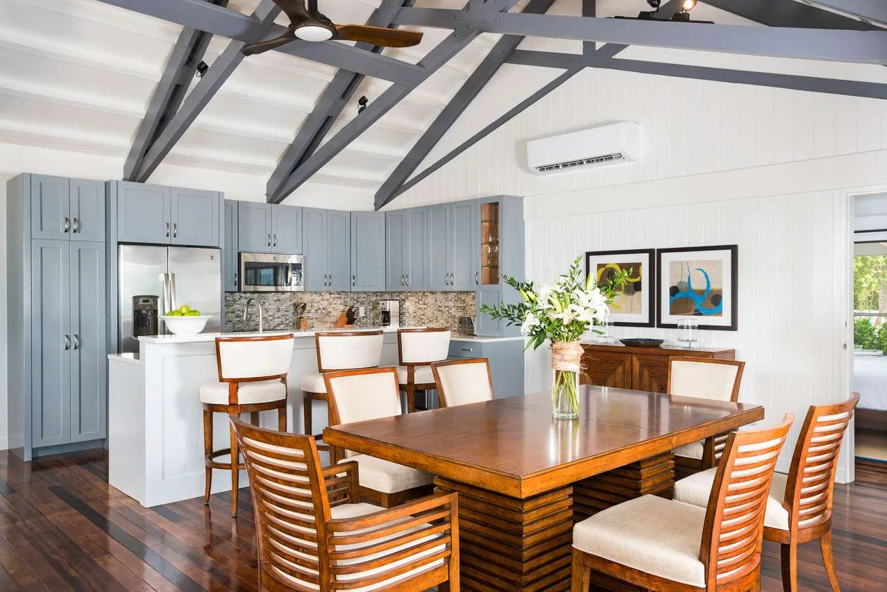 The whimsical interior of the Villa Hawksbill Beach House will sweep you away. Flowing from the white sand, the stylish open-plan villa contains a living room, formal dining area, and modern kitchen. Tropical ocean breezes blow into the contemporary grey and white interior. Vaulted ceilings with exposed wooden beams add a rustic, beachy vibe to the entire space.