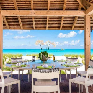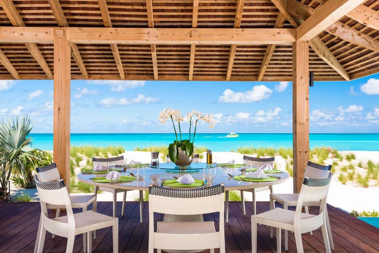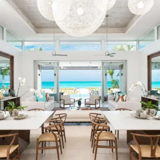 The indoor dining area has two tables, seating a total of 16 guests. With an eye-catching light fixture hovering above, it’s an elegant spot to enjoy a festive dinner party, feasting on the fresh flavors of the Caribbean.