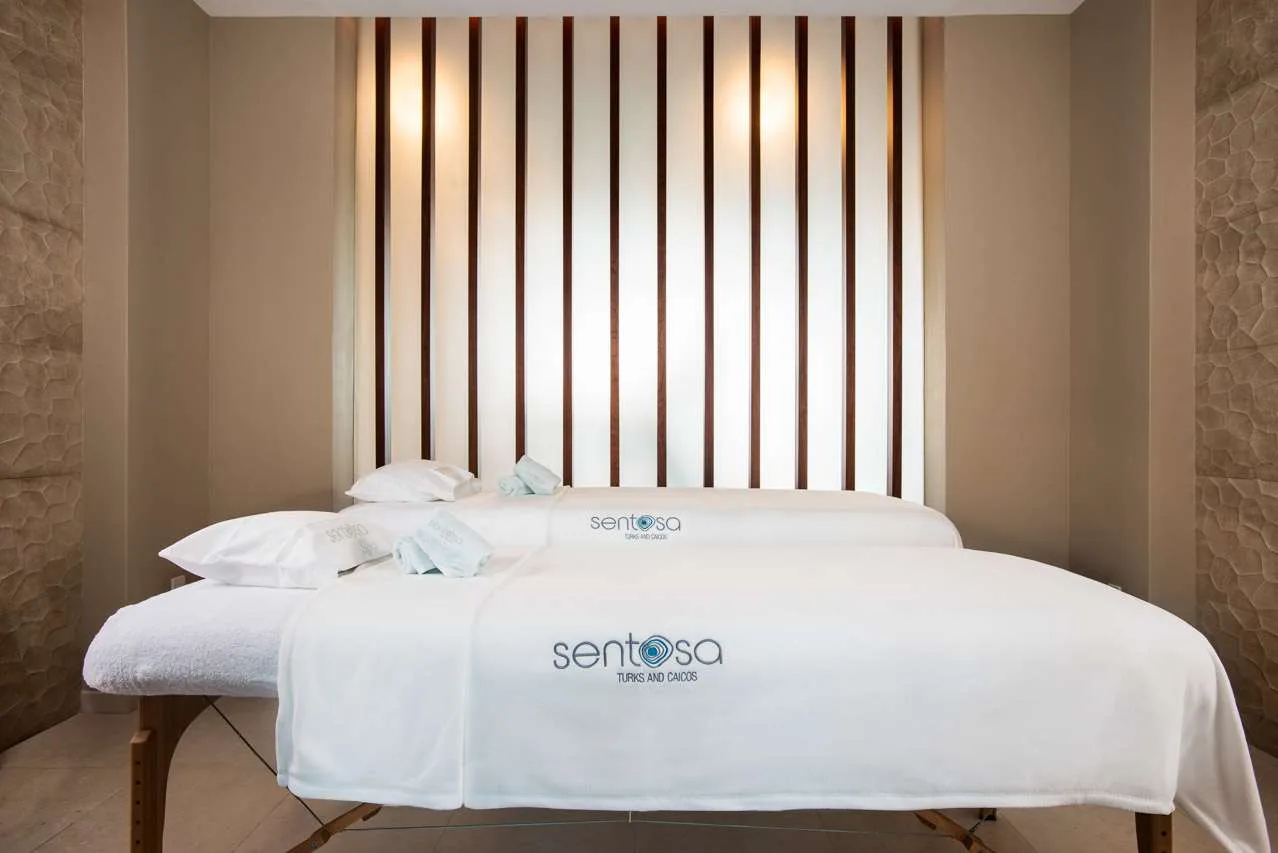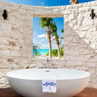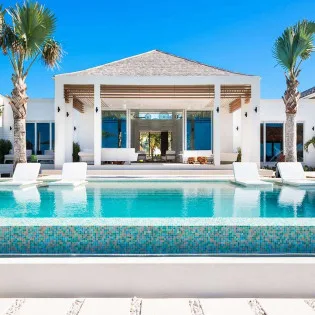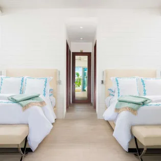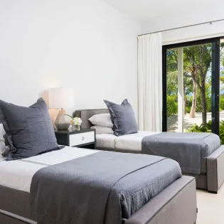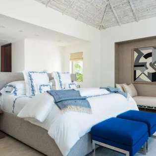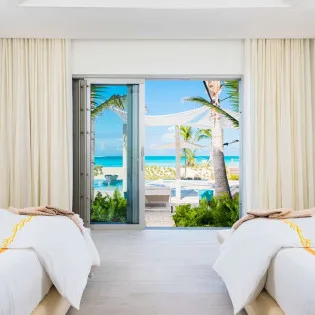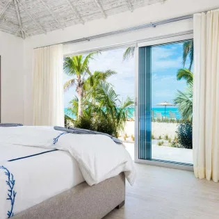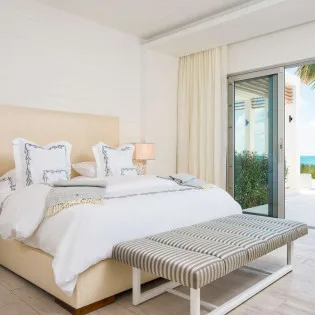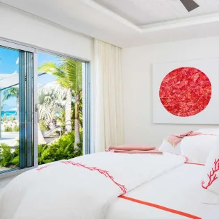 There are 8 fabulous bedrooms at Villa Sentosa, all of them with ensuite bathrooms and featuring a striking piece of art that sets the theme for each room. The curved construction of the villa allows each room a wonderful vista of the stunning Grace Bay Beach.