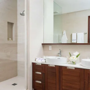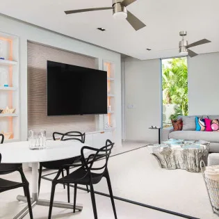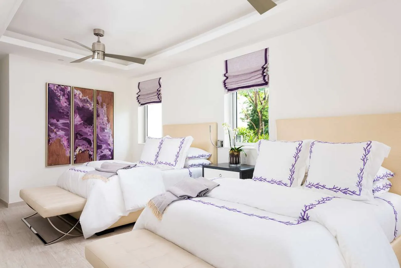 Offering a contemporary design and the latest amenities, Villa Sentosa is a calming and luxurious oasis for a Caribbean getaway. Modern artworks bring splashes of creative life into the cream-colored interiors, while the island light streams in through large windows and sliding glass doors.
