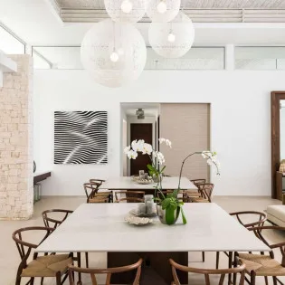 As soon as you step inside Villa Sentosa, you’ll be swept off your feet. The large and airy great room combines living and dining areas beautifully. The white washed room with tall ceilings is lined with windows which let in plenty of natural light, illuminating striking artworks, handmade furniture, and soft wooden details.