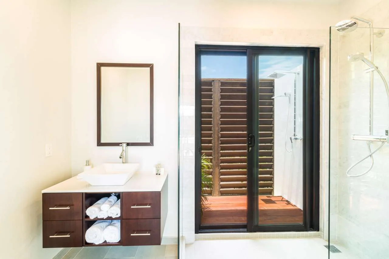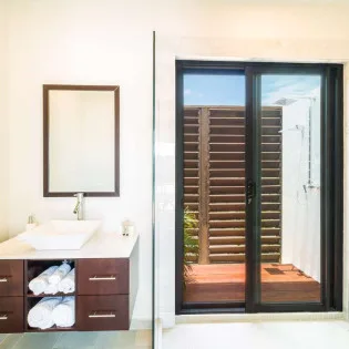 Enter the villa through private louvered doors to a courtyard with ample seating, an outdoor dining area and private swimming pool. Immediately on your right is the self-contained master bedroom with queen bed, ensuite bathroom and walk-in closet.