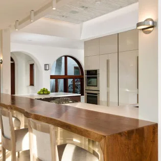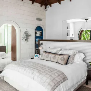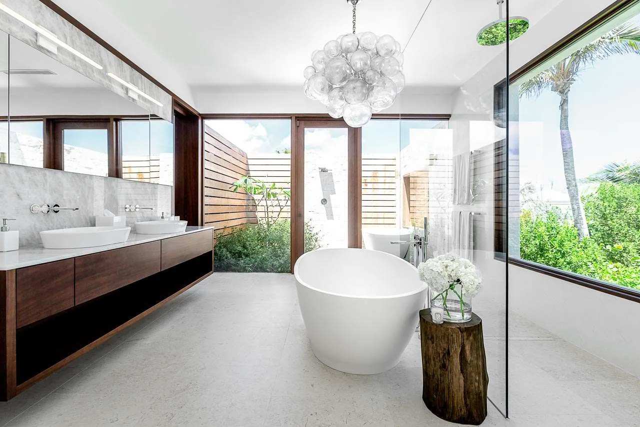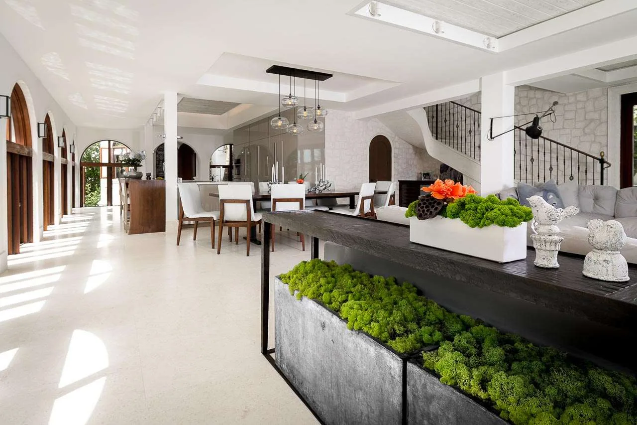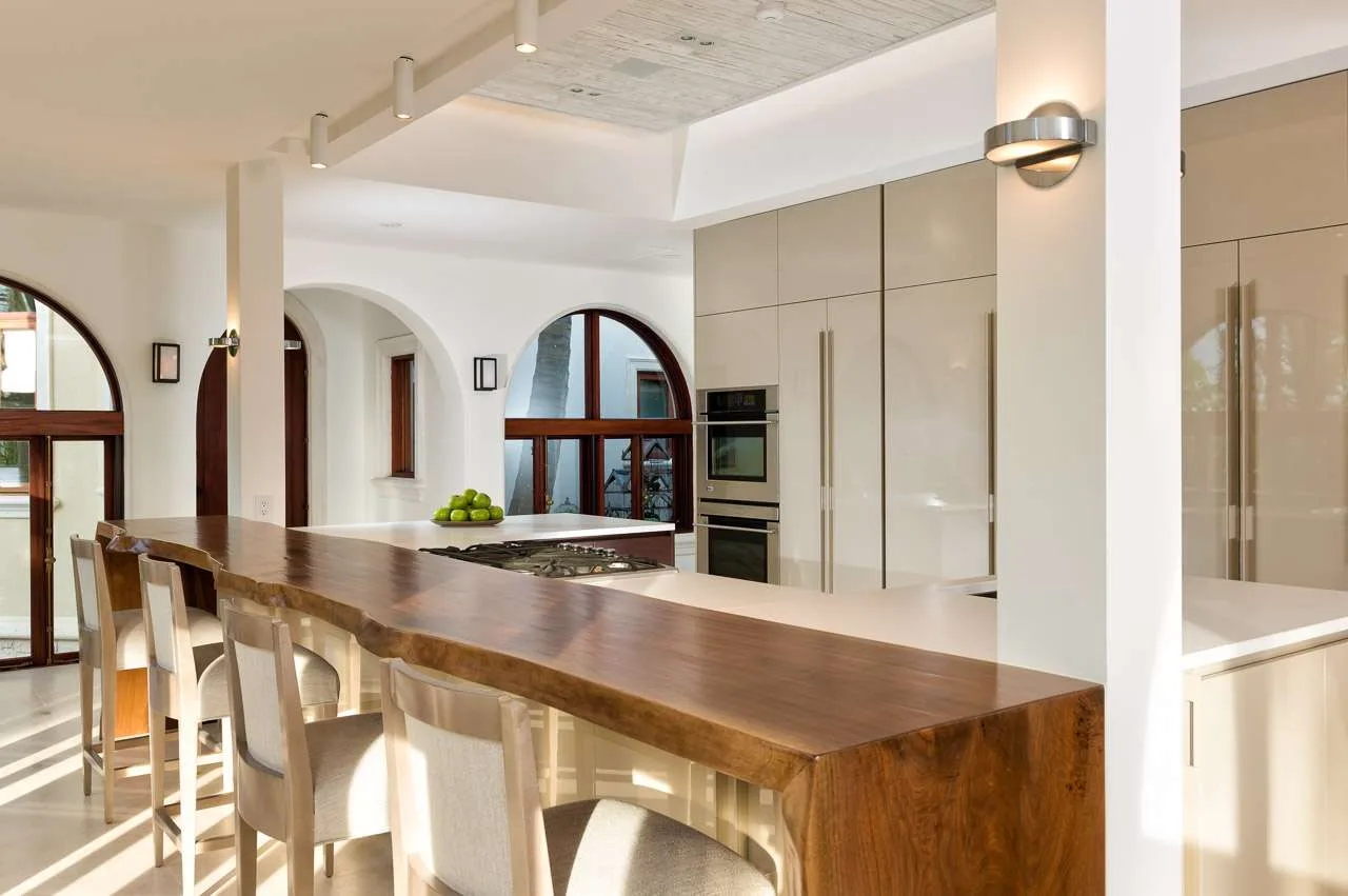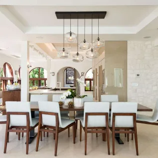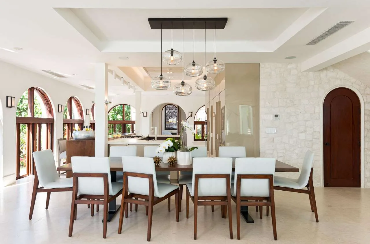 The beautiful dining room table right next to the living room has space for 10 people, sitting beneath a stylish and bubbly light fixture. Light streams through the arched doors and windows, clad in a chic tropical wooden trim. Leisurely dinners here are fabulous.