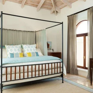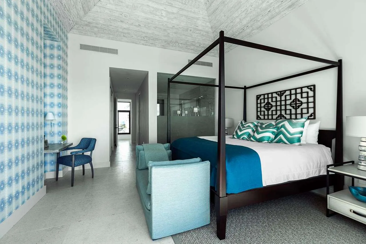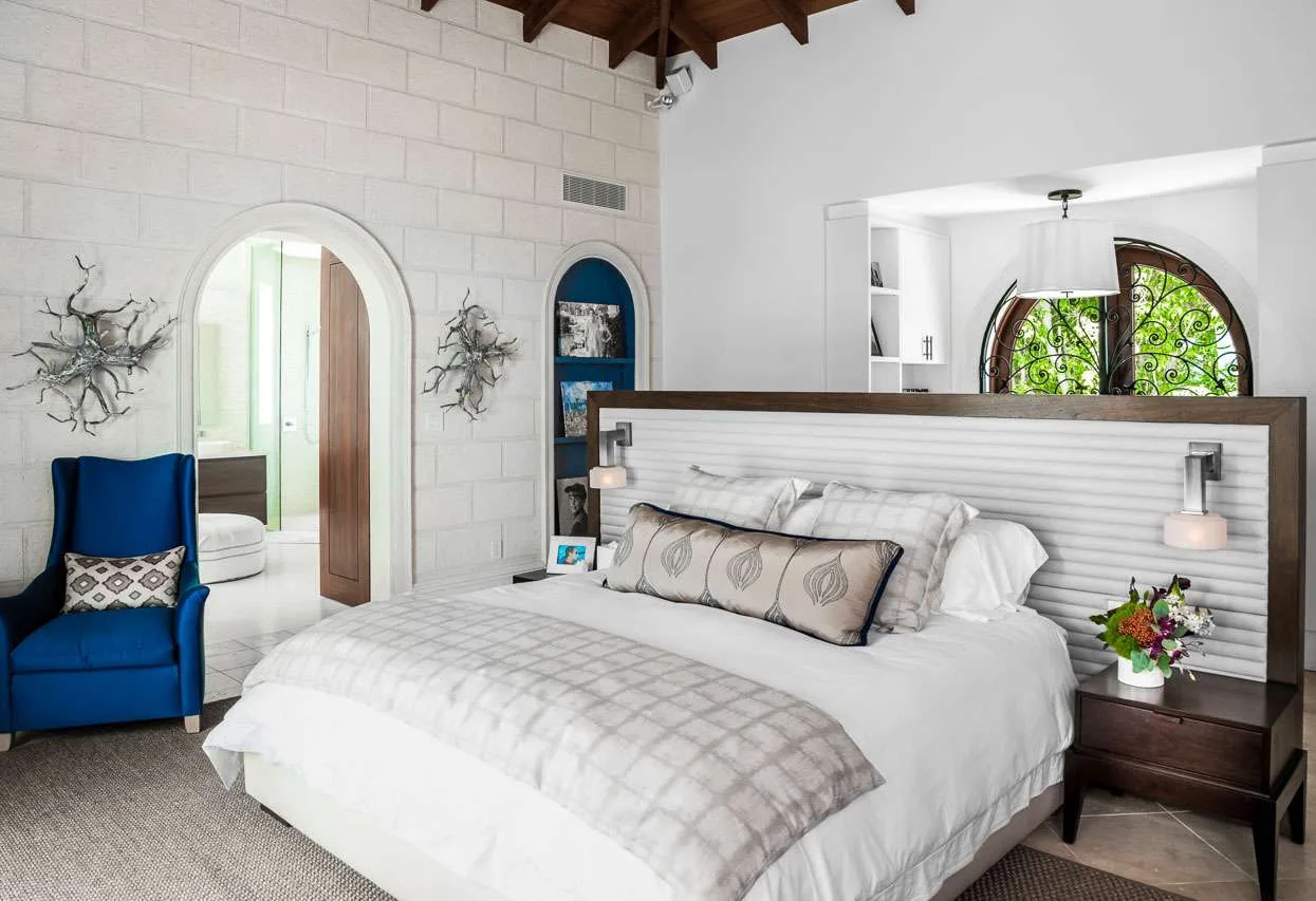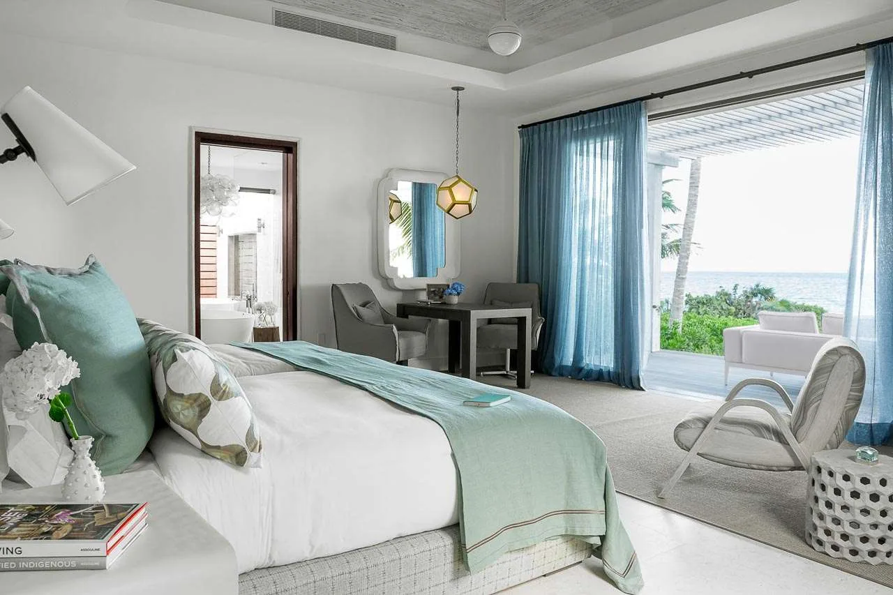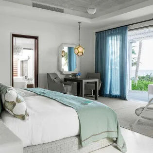 The master suite is distinctive and opulent. Light streams in through large windows, illuminating the grand king-sized bed in the center of the room. A private terrace lets you gaze out at the ocean, while the spacious ensuite features a lavish freestanding tub, perfect for a long soak at the end of the day.