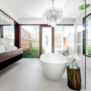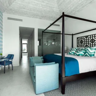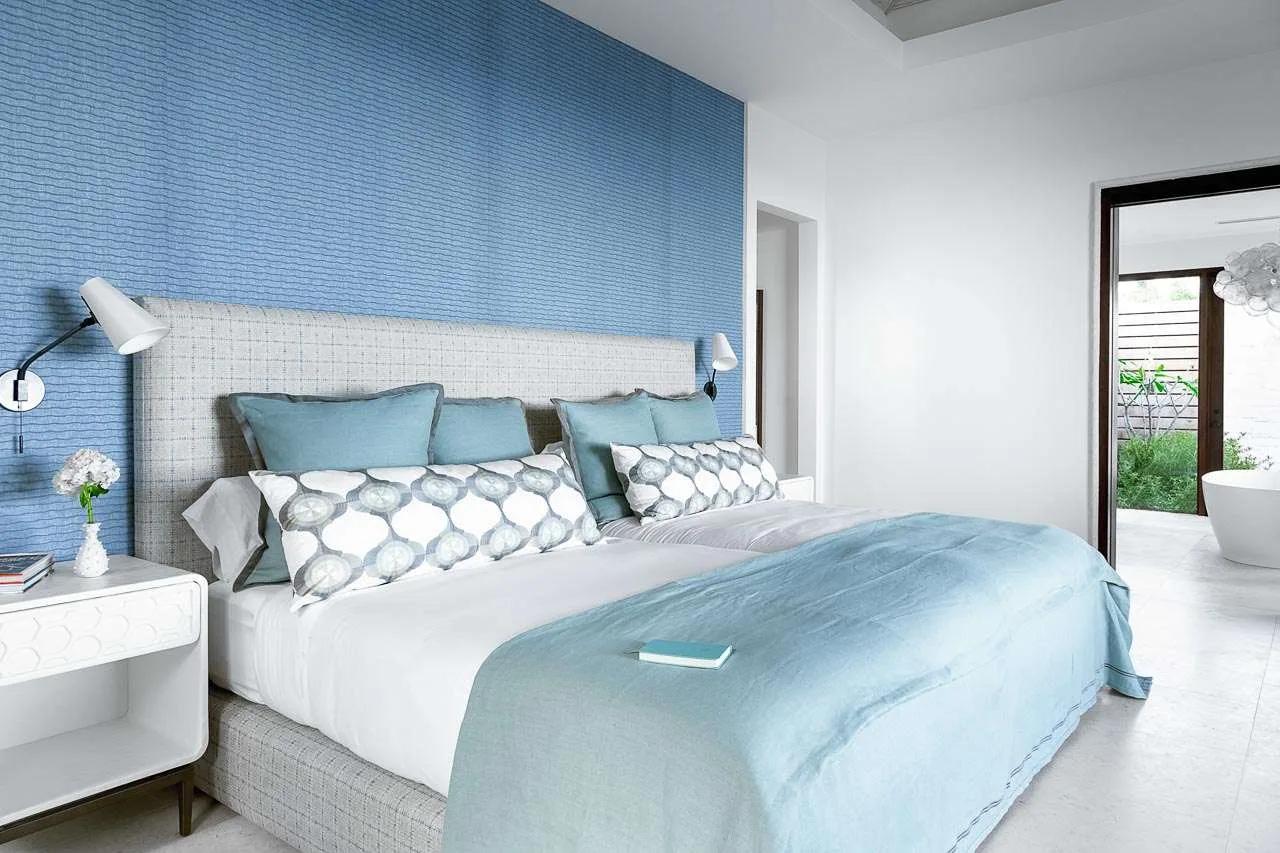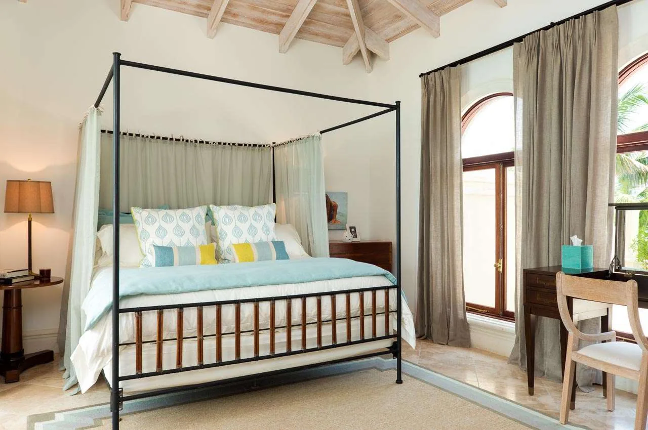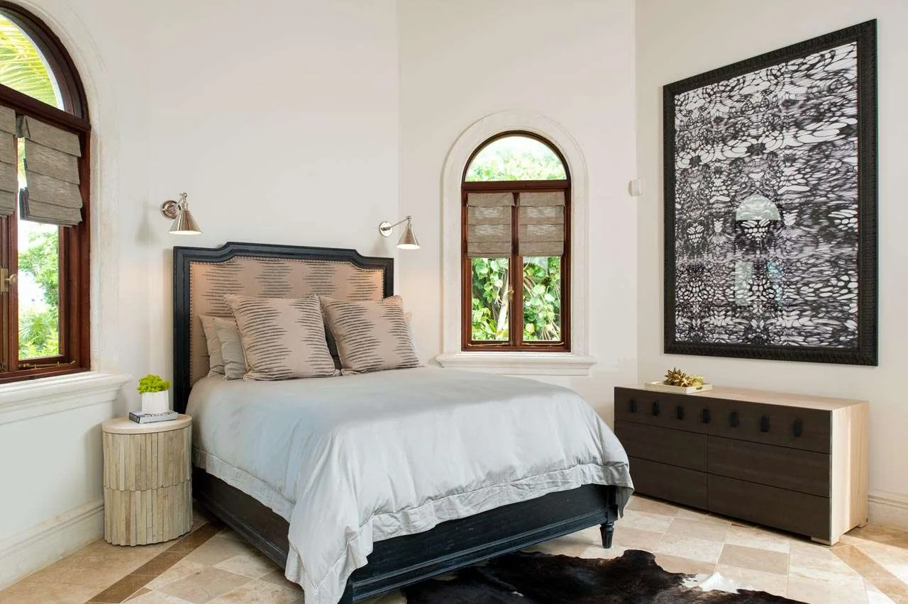 The master suite is distinctive and opulent. Light streams in through large windows, illuminating the grand king-sized bed in the center of the room. A private terrace lets you gaze out at the ocean, while the spacious ensuite features a lavish freestanding tub, perfect for a long soak at the end of the day.