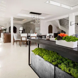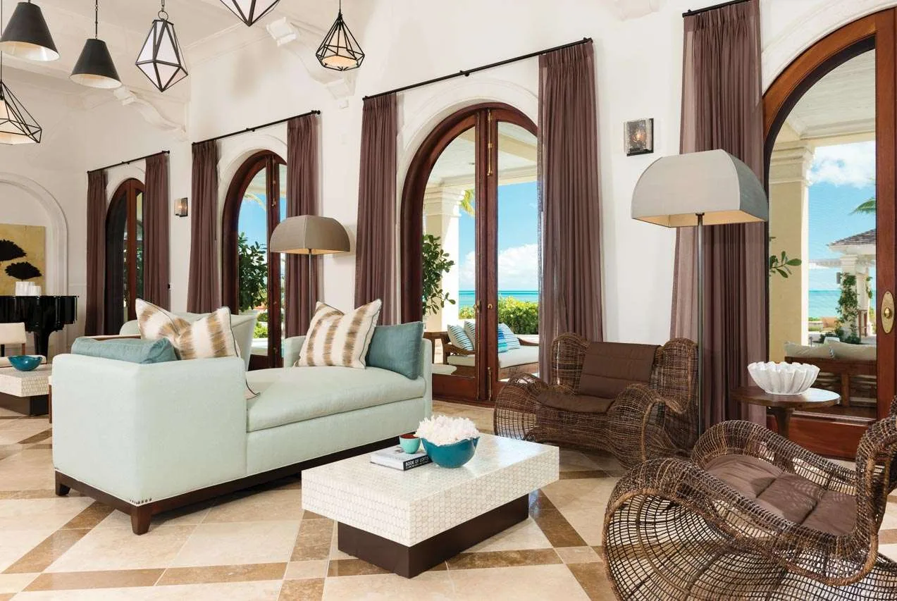 A long sitting gallery features glass doors on both sides, letting the island light stream in on several plush sofas. A grand piano stands against the corner wall, while island artworks and antiques decorate the impressive space.