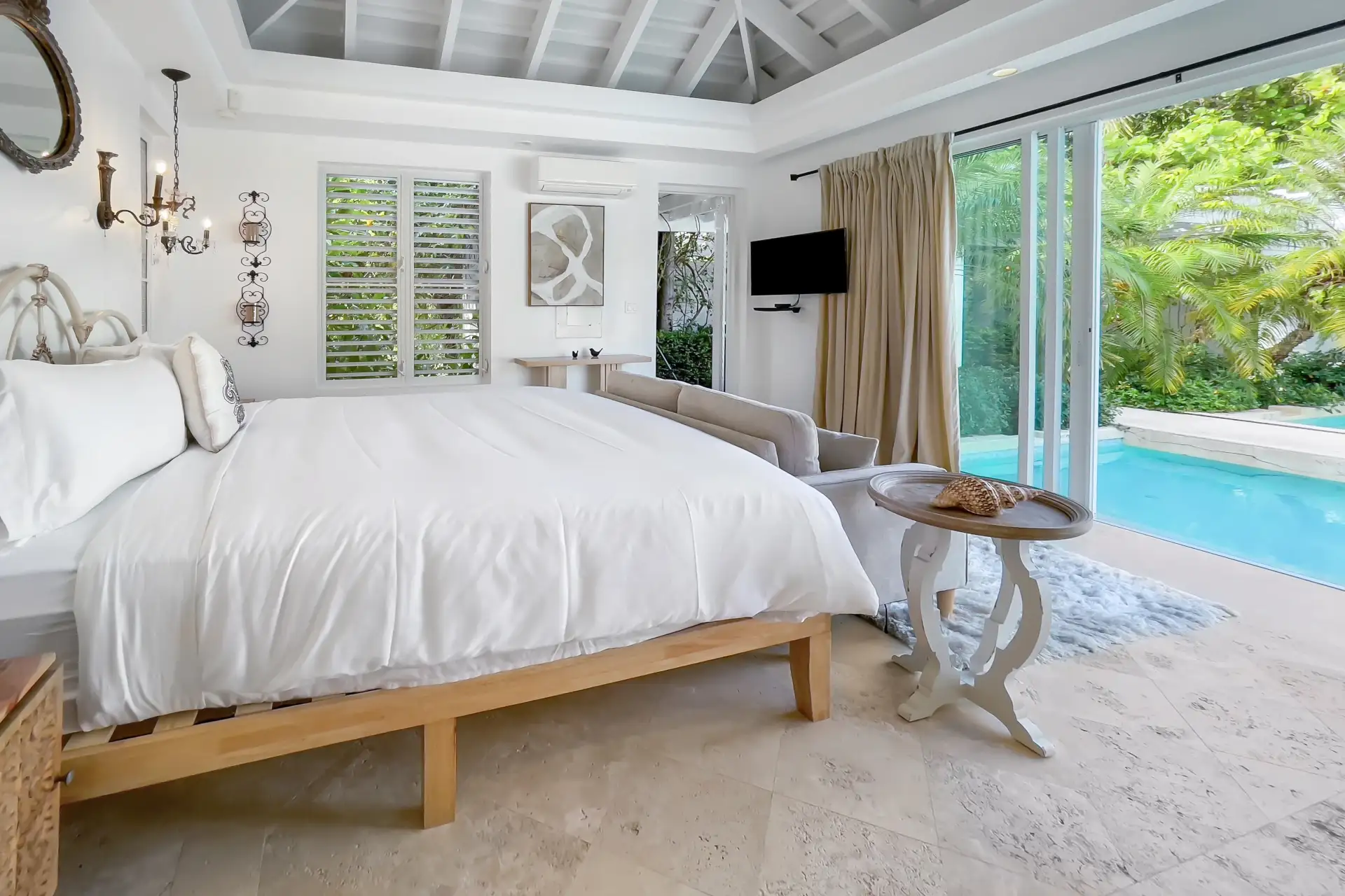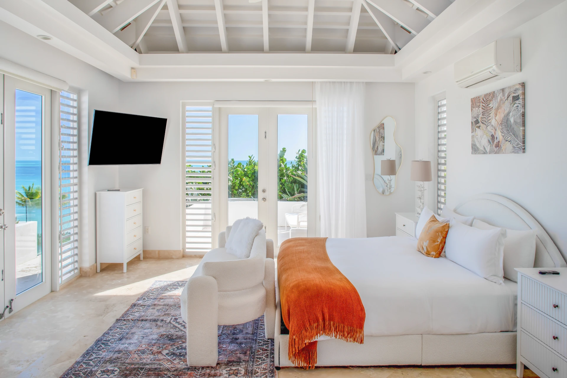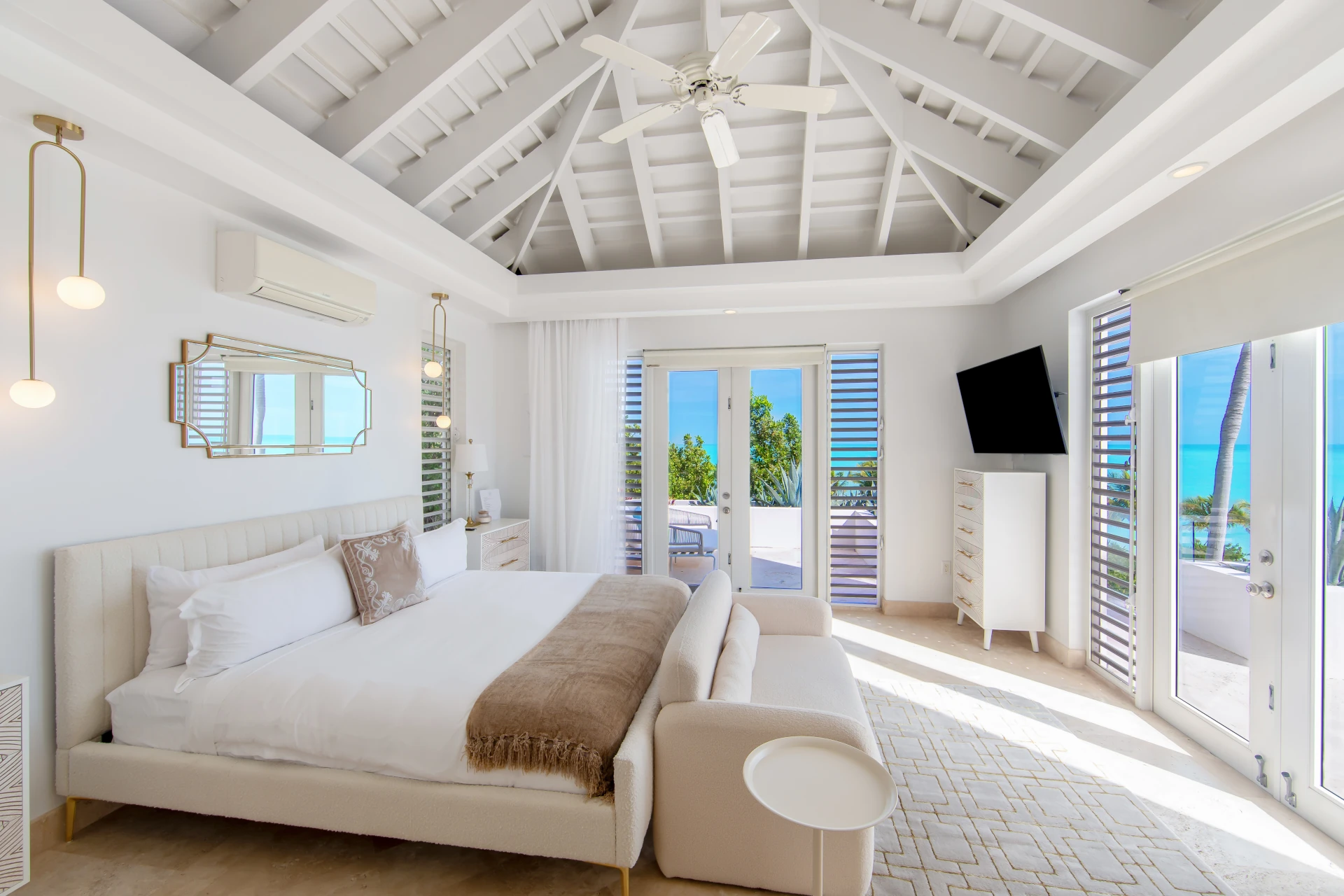 The seven-bedroom suites sleep up to 14 guests. Select suites even open directly onto the pool via private steps. Each suite features double vanities, Smart TVs with Netflix, Apple TV, and cable, ensuring both comfort and convenience. Fall asleep to the soothing sound of waves lapping the shore.