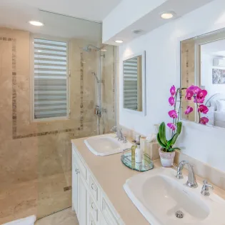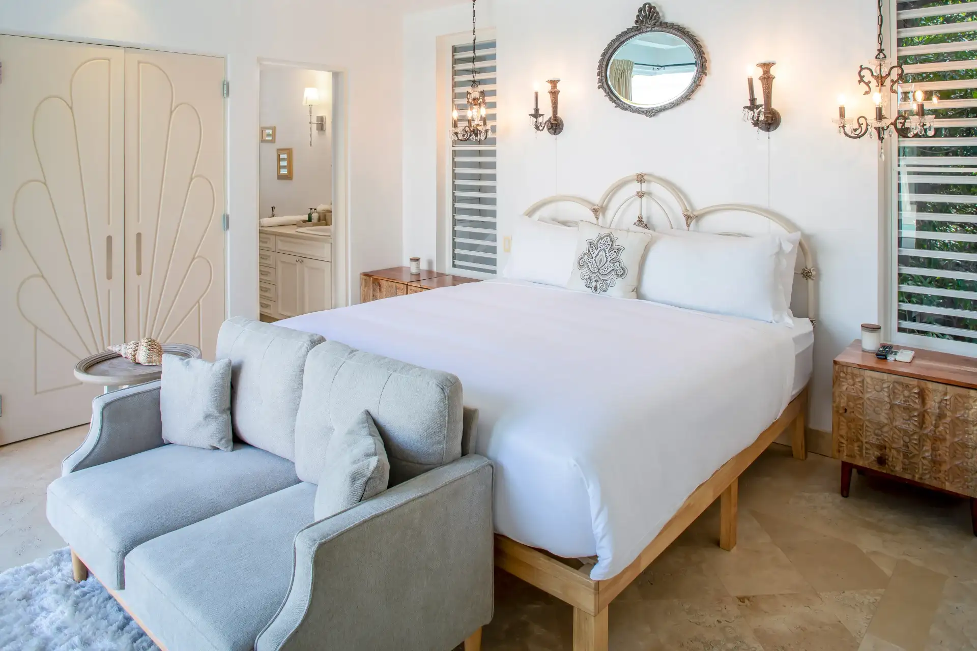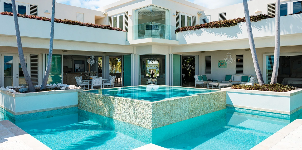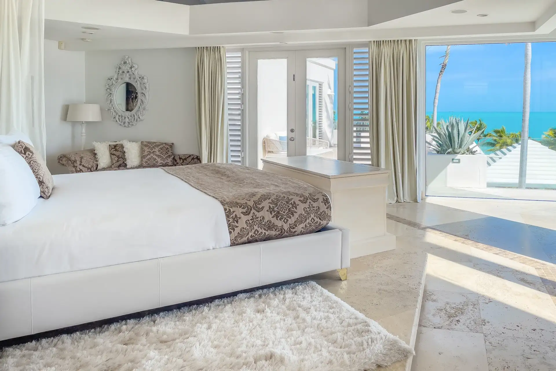 The seven-bedroom suites sleep up to 14 guests. Select suites even open directly onto the pool via private steps. Each suite features double vanities, Smart TVs with Netflix, Apple TV, and cable, ensuring both comfort and convenience. Fall asleep to the soothing sound of waves lapping the shore.