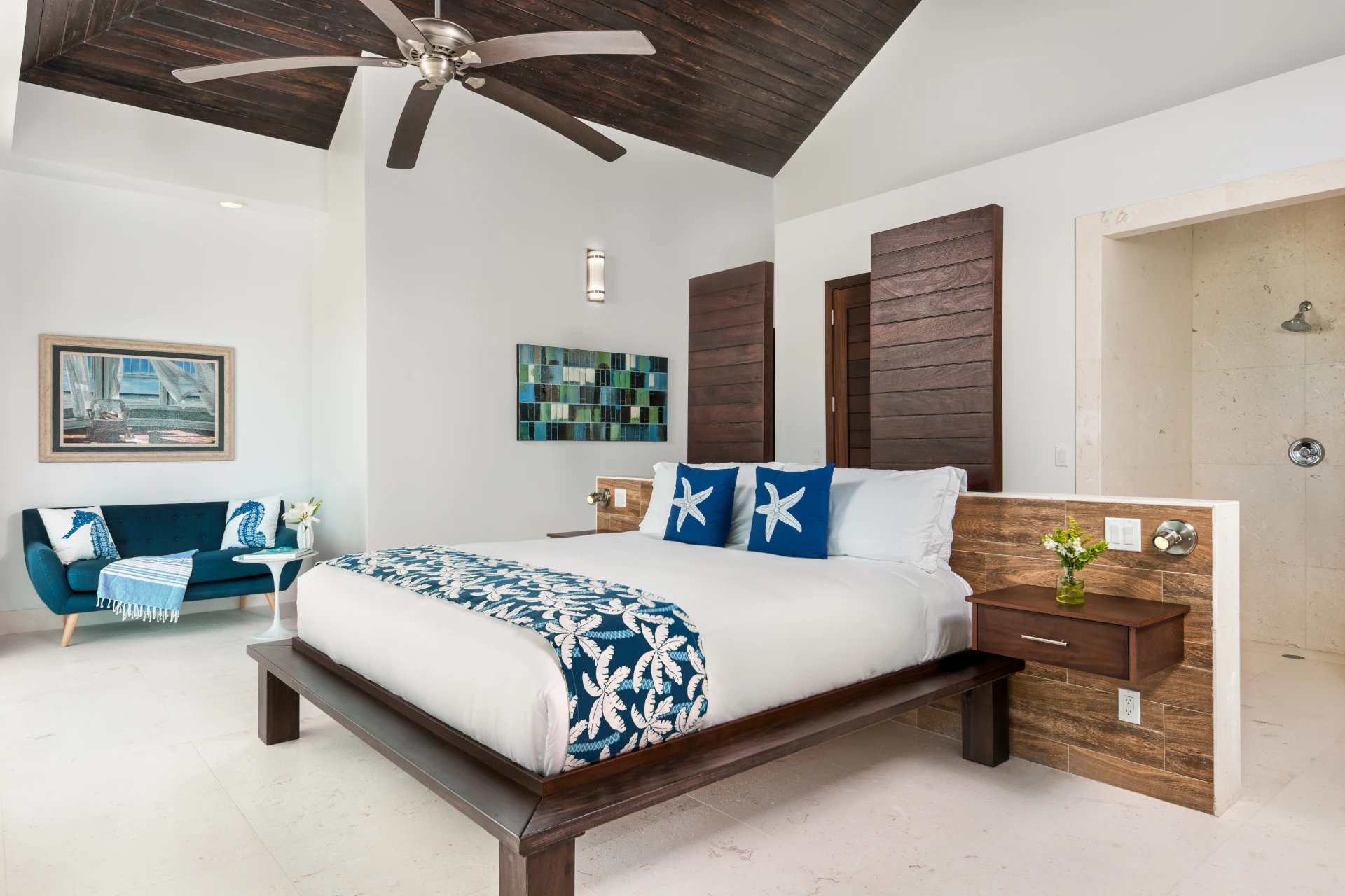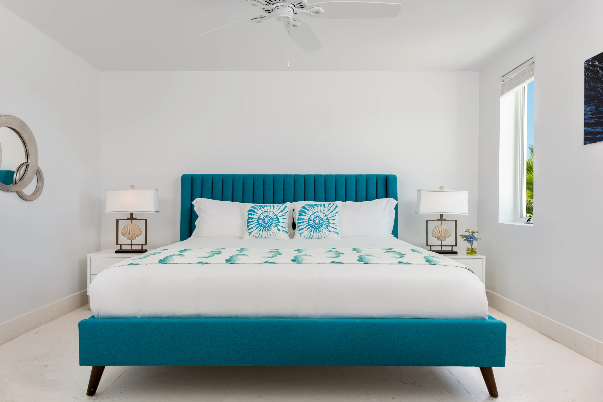 The spacious king bedroom suites offer comfort and privacy after long days by the water. One suite is located on the main level, while two are upstairs, each with its own private balcony. One balcony looks out toward the open sea, and the other overlooks the boats gently moored in Turtle Cove Marina.