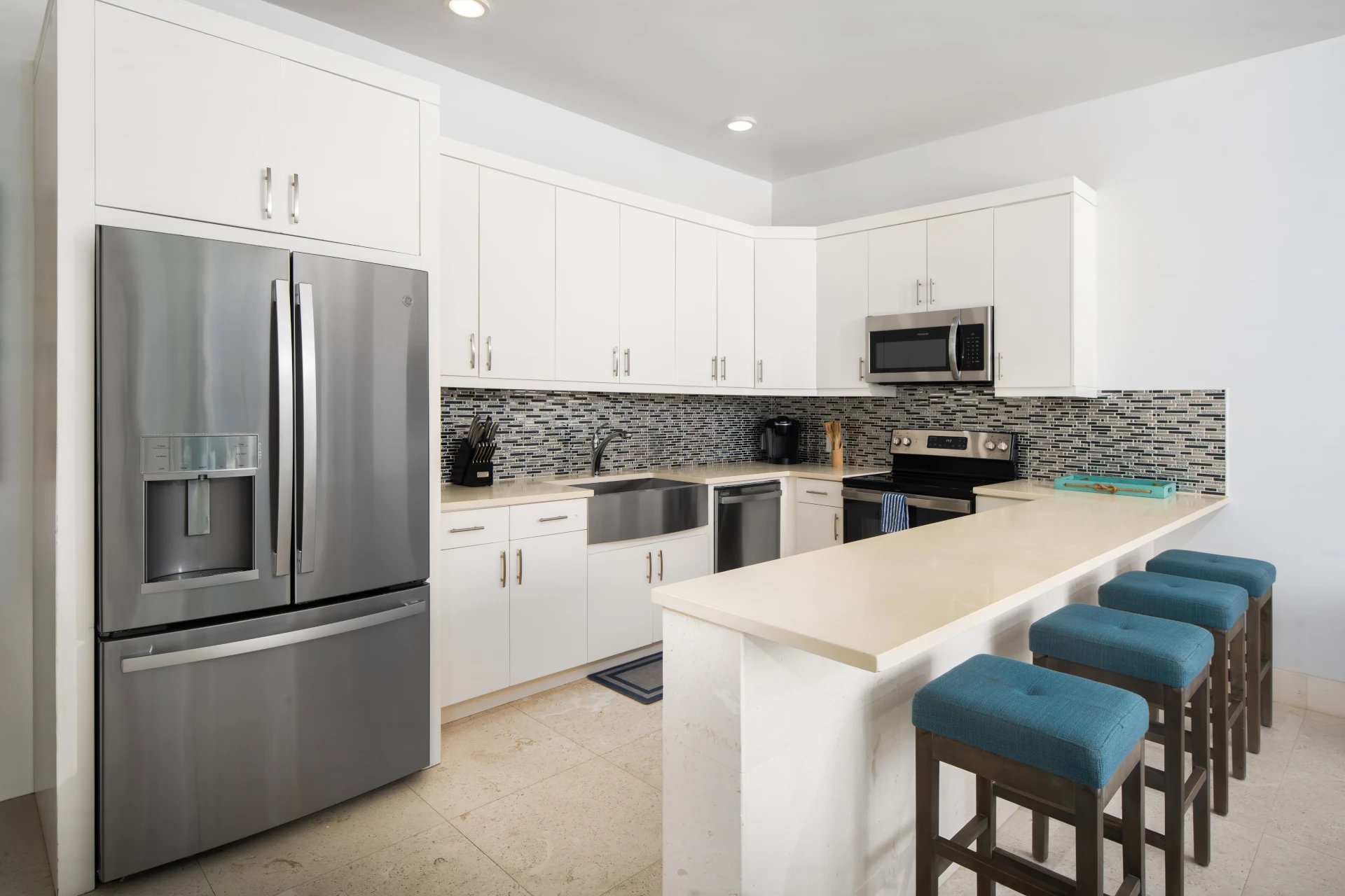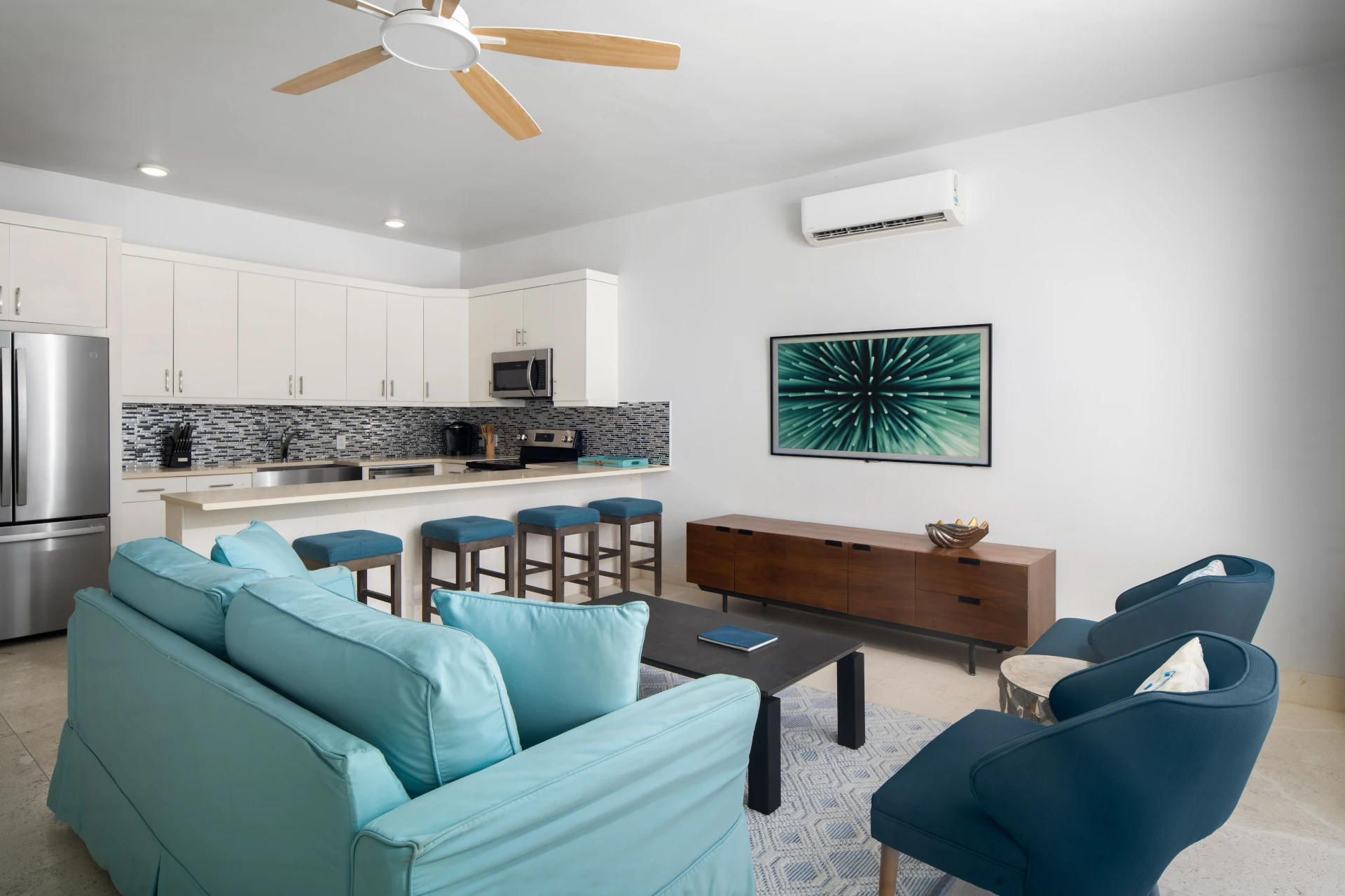 Inside, the home features a fresh, modern design with bright interiors accented by soft coastal tones. The open-concept living area combines a fully-equipped kitchen, dining space, and comfortable seating, all flowing directly onto the pool terrace to create a seamless indoor-outdoor experience.
