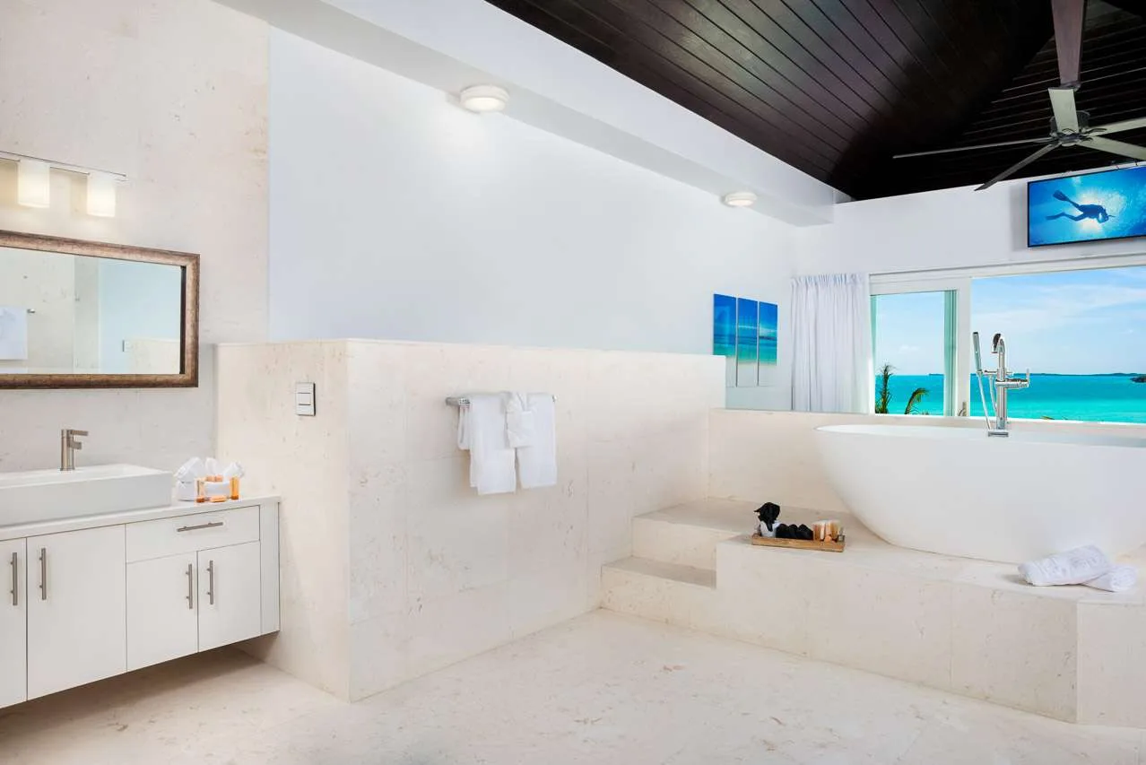 Both levels of this 2-story villa enjoy blissful views of white sand and the turquoise sea. The minimalist interior reflects the outdoor scenery: calming whites are offset by vibrant ocean artwork and splashes of beach color.