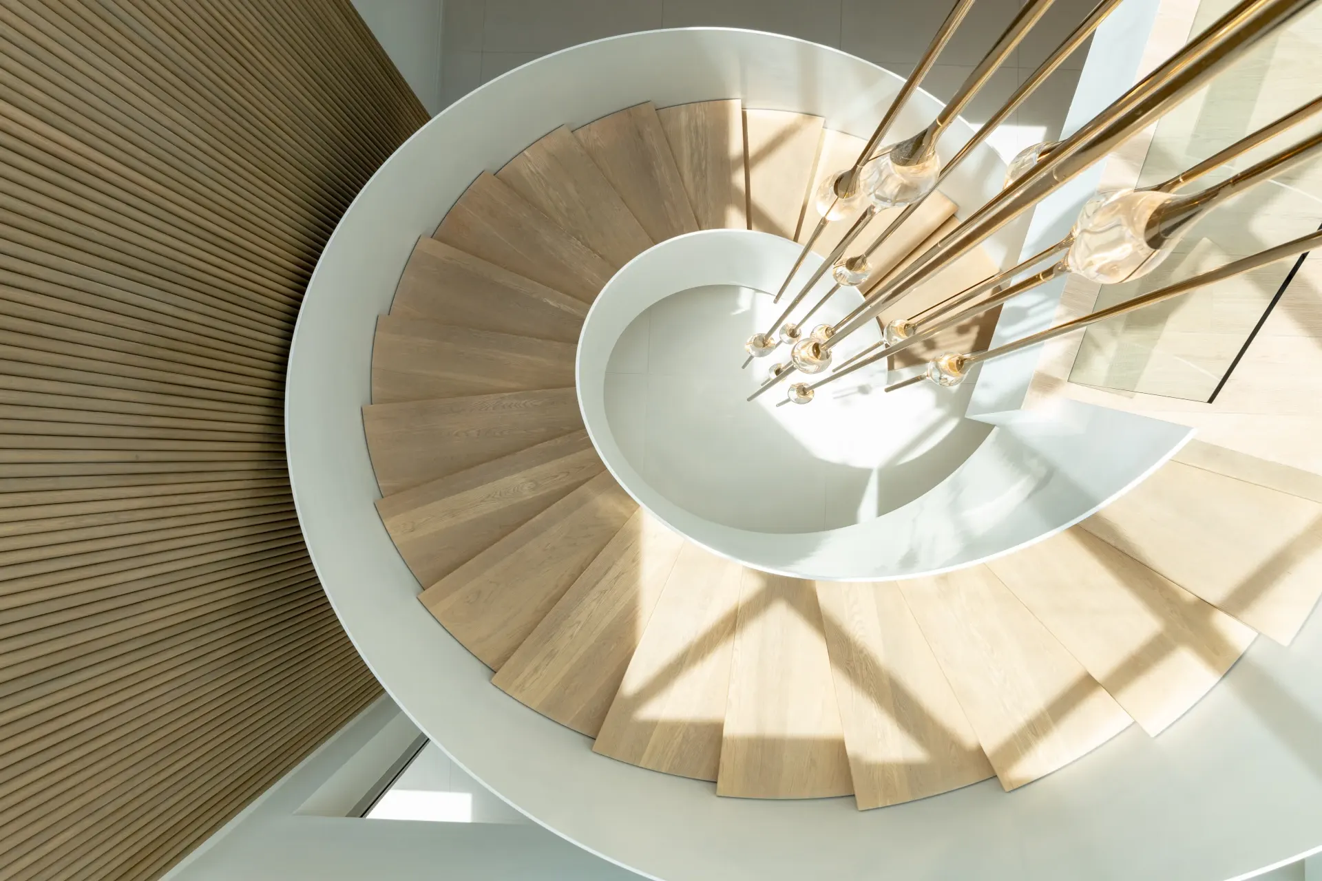 Modern and elegant, the interior showcases exceptional craftsmanship and design—from the expansive living room to the grand dining table carved from a single slab of walnut wood and the striking sculptural staircase.