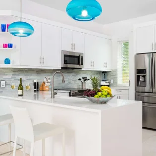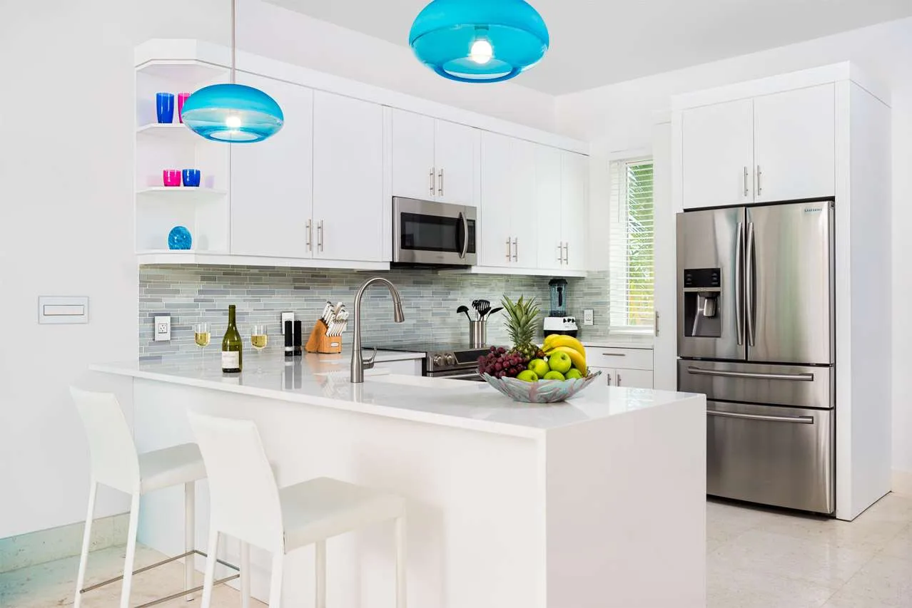Villa Sorrento has a sleek and modern kitchen, with the latest appliances. Foodies will love experimenting with local island flavors here. A breakfast bar with 2 stools is a great place to enjoy your morning coffee before diving into the pool outside.