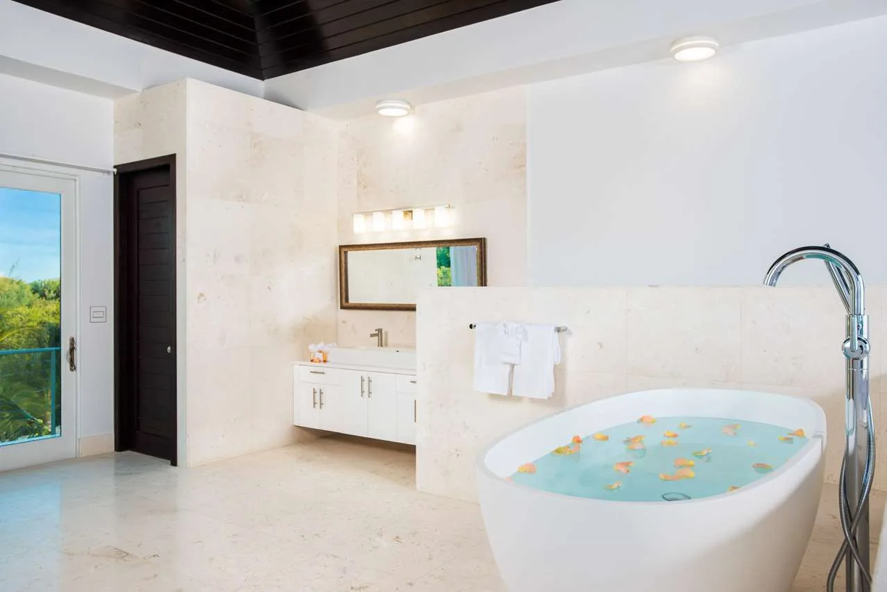 The ensuite bathroom behind the bed has a large freestanding tub, a pleasant way to wash off the salt and sand after a day at the beach. The gentle sound of the tide will lull you to sleep each night.