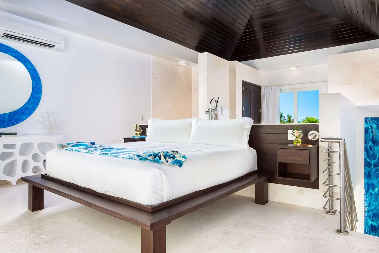 The master suite at Villa Sorrento is on the second level, with a comfortable king-sized bed overlooking the ocean. Beautiful ocean décor and vibrant blues mirror the water outside, glimpsed from the bedroom’s furnished balcony.
