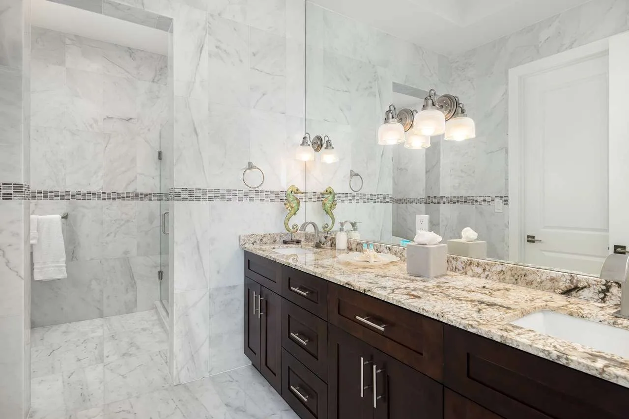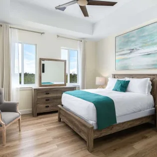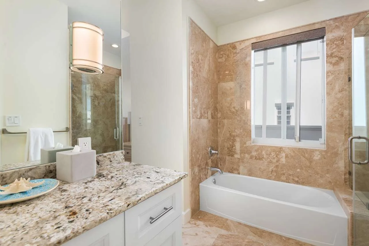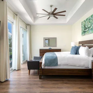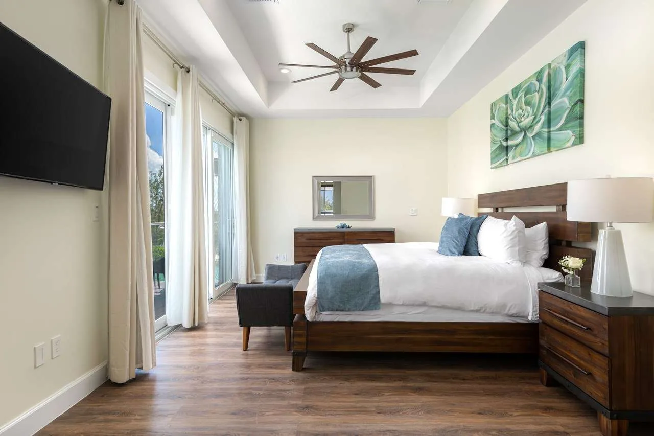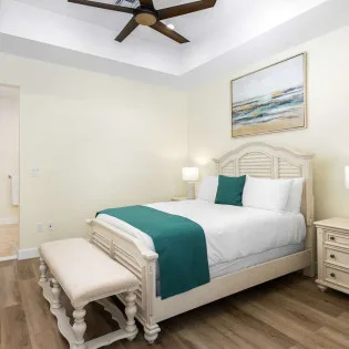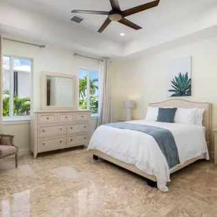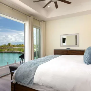 The master has a canal view and a king-size bed, there are 2 garden view bedrooms each with a queen-size bed and the fourth bedoom has a canal view and full-size bed. All bedrooms have full ensuite bathrooms with a tub and shower.