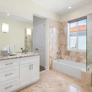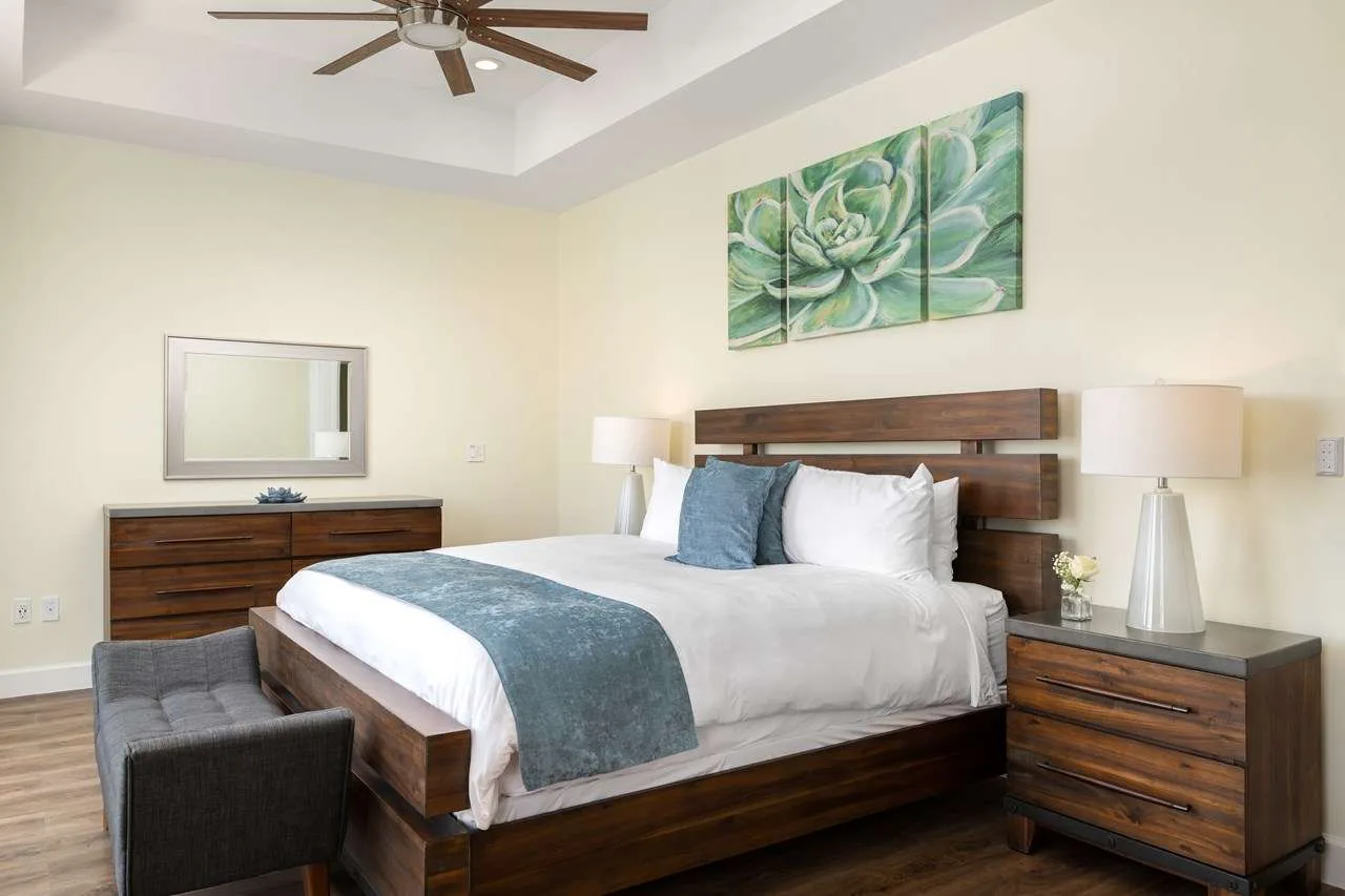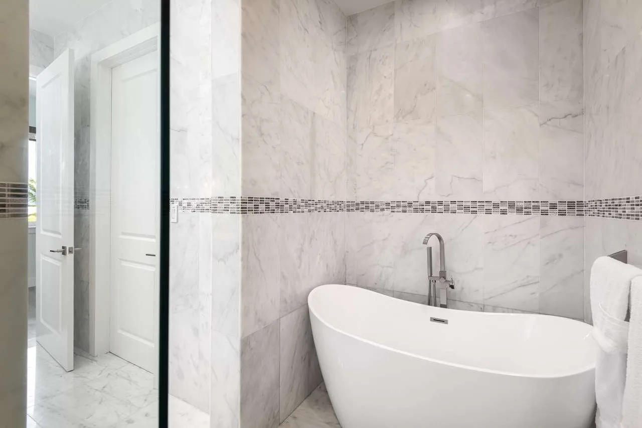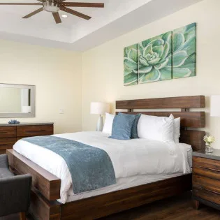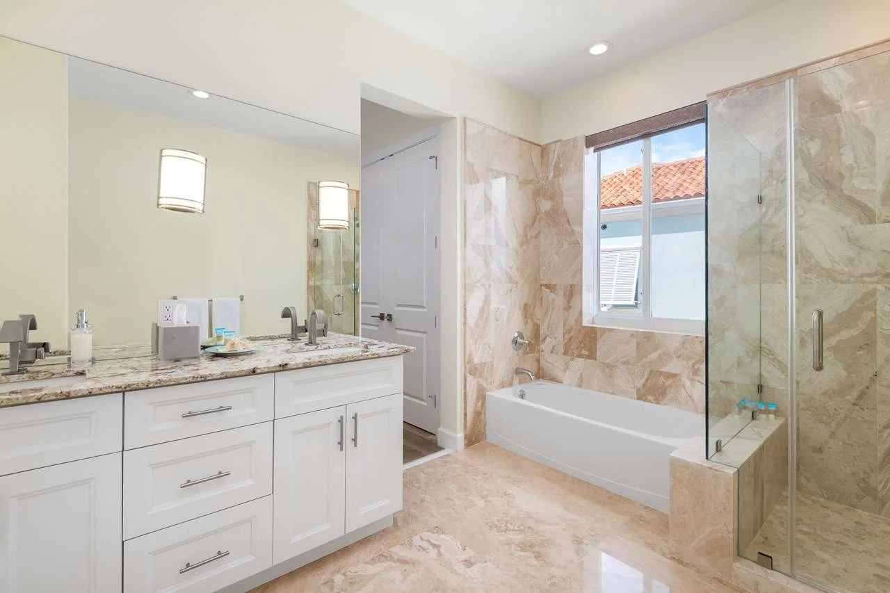 The master has a canal view and a king-size bed, there are 2 garden view bedrooms each with a queen-size bed and the fourth bedoom has a canal view and full-size bed. All bedrooms have full ensuite bathrooms with a tub and shower.