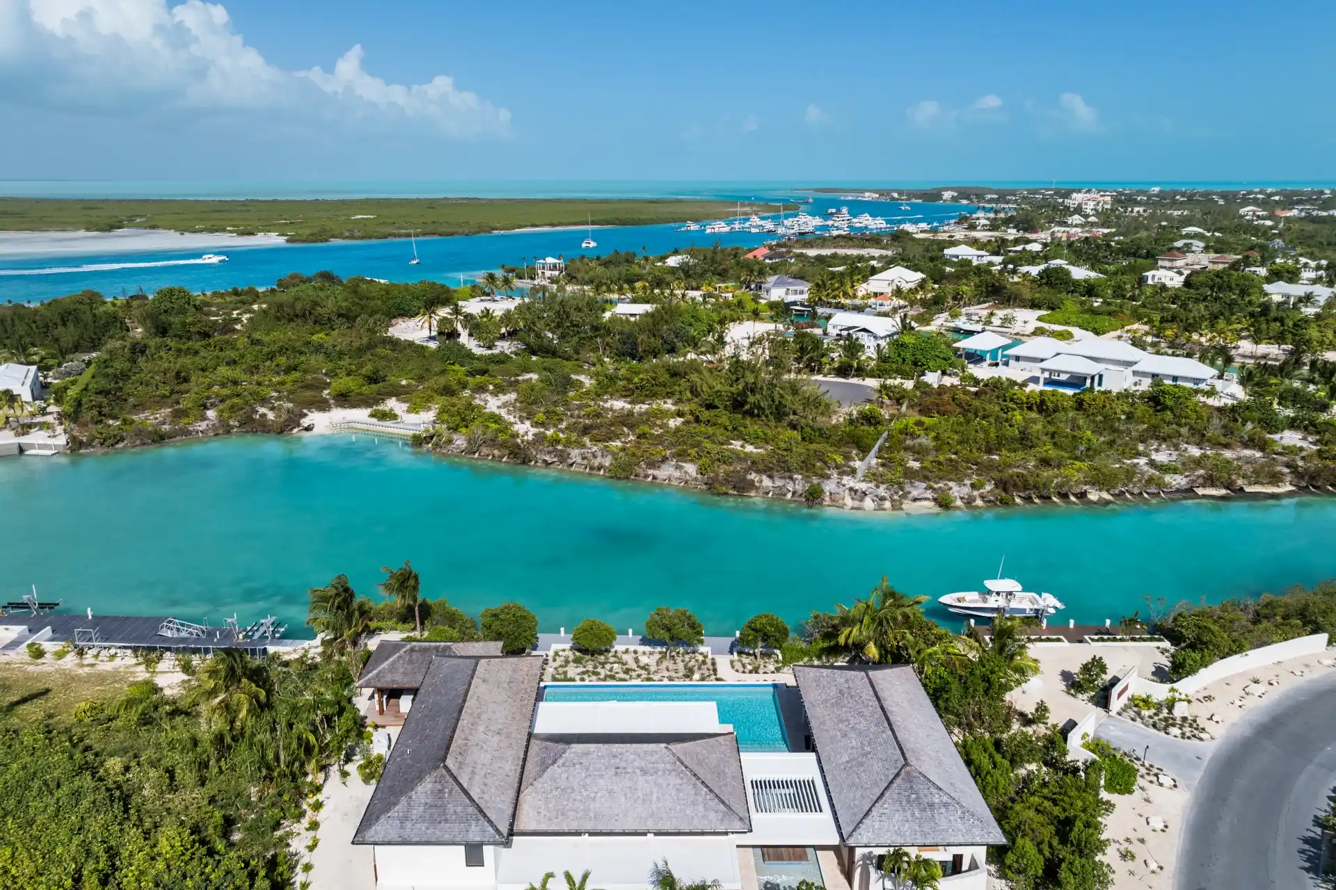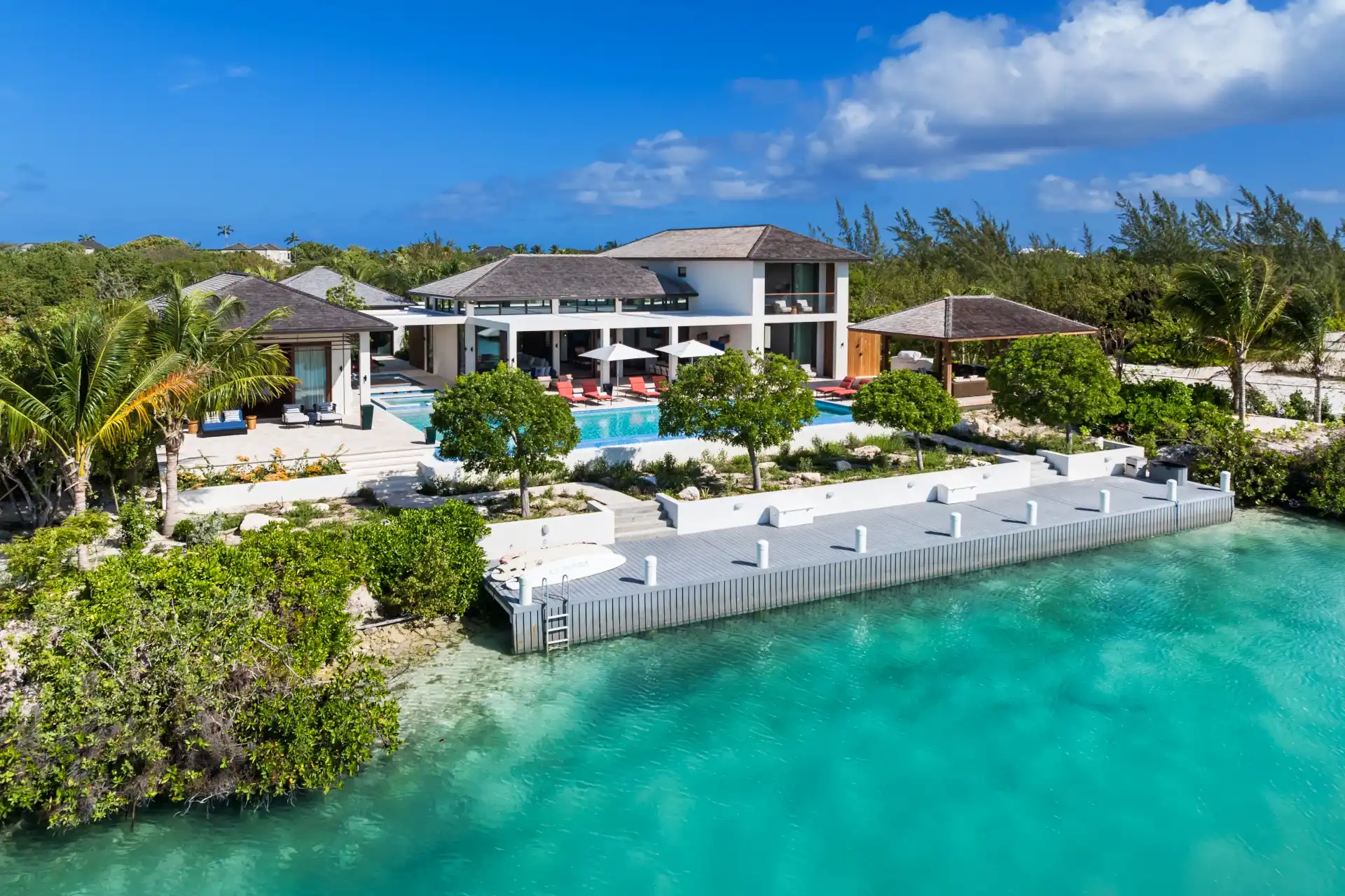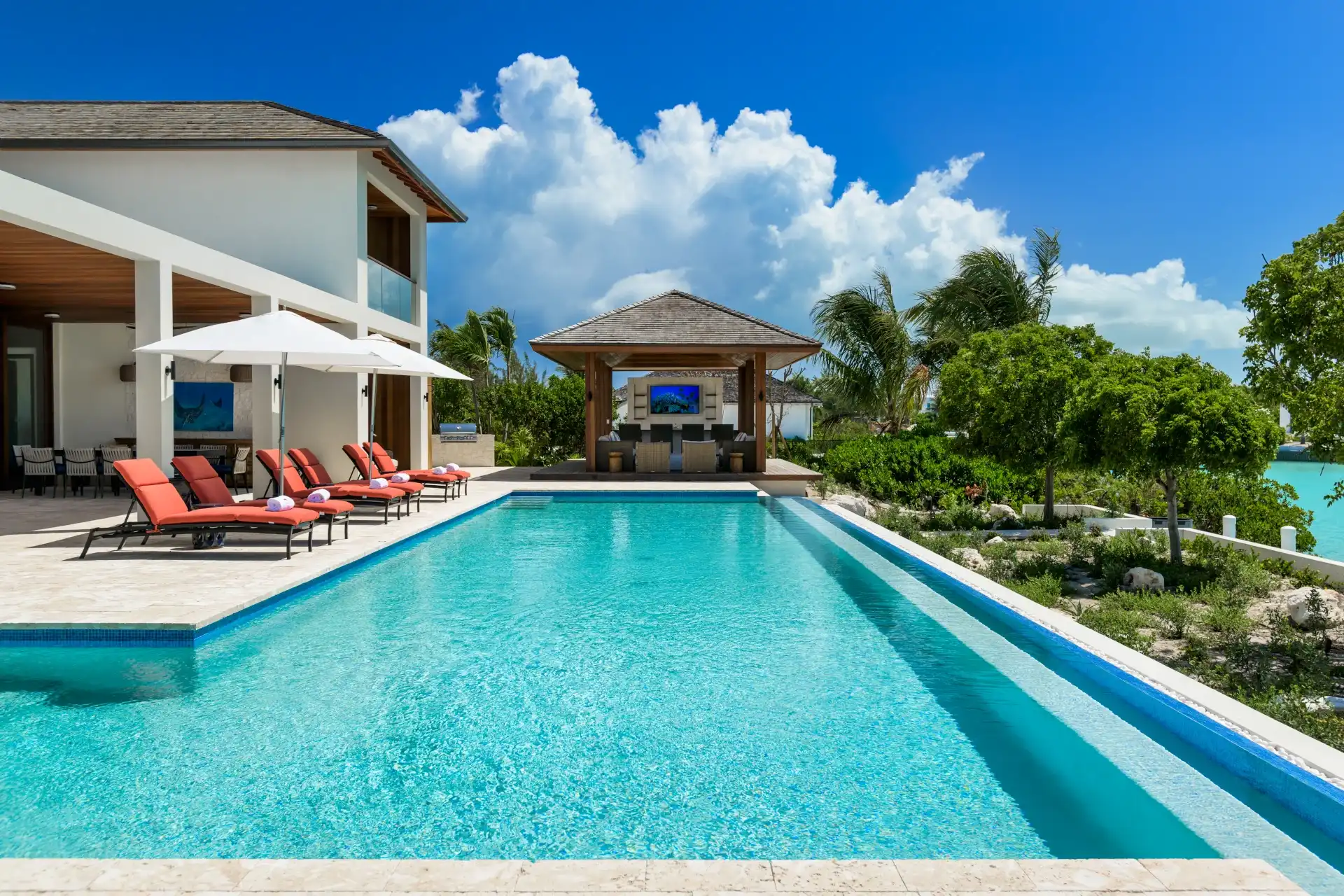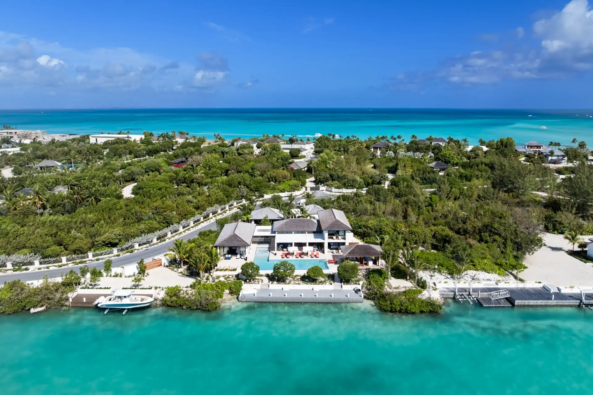 Villa Sundance offers both style and convenience—just an eight-minute drive to Grace Bay, yet tucked into the quiet luxury of Leeward. Days can be spent basking by the pool, shaded under breezy pavilions, watching movies, or setting out on the water from your own dock.