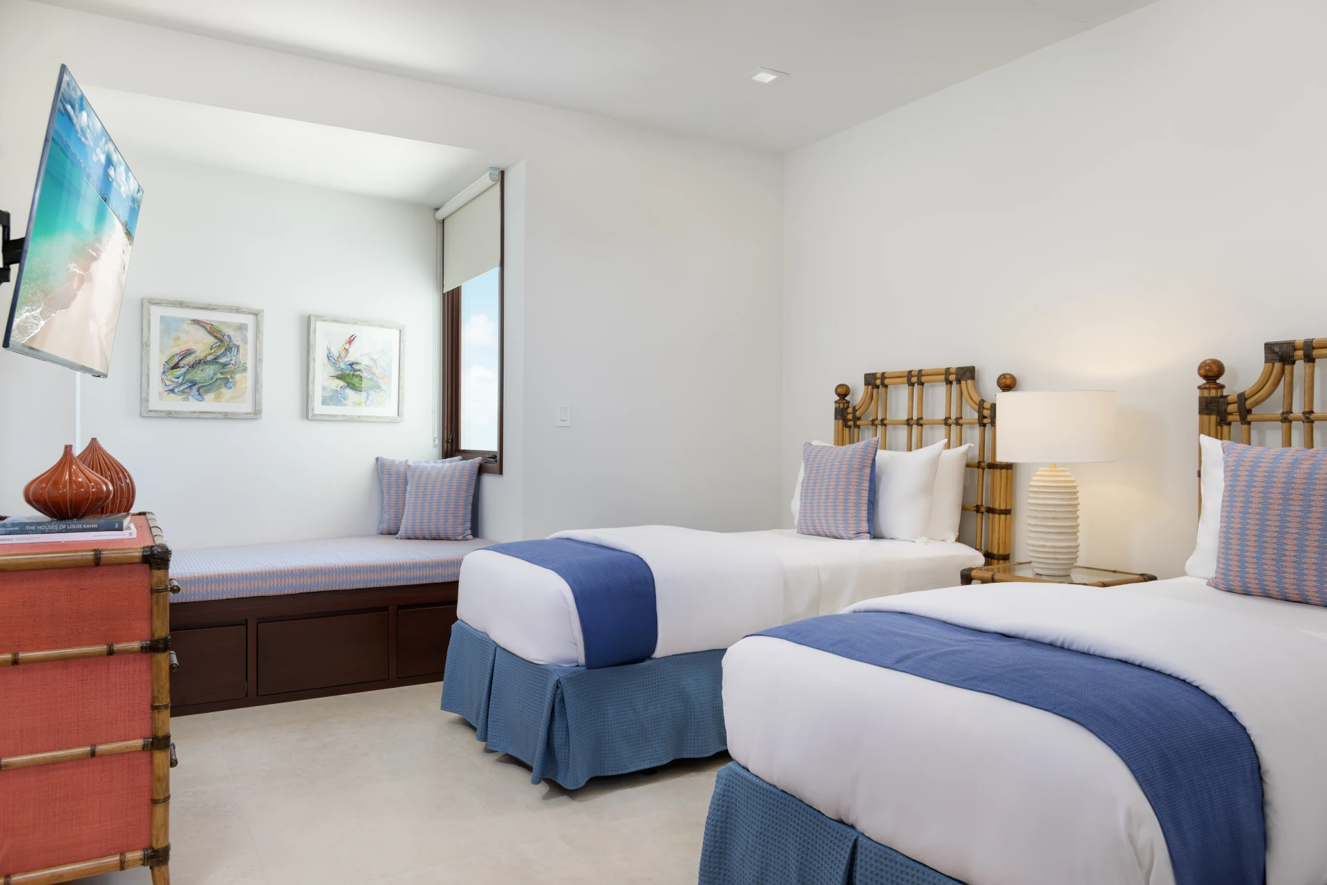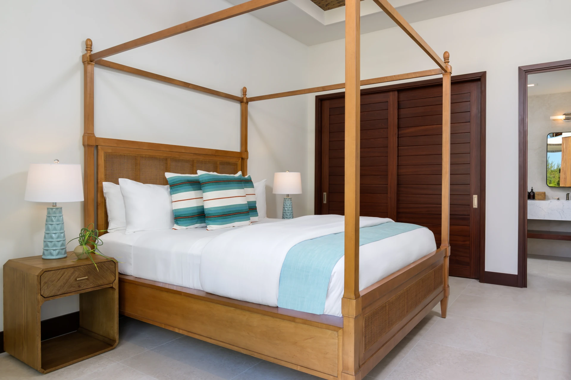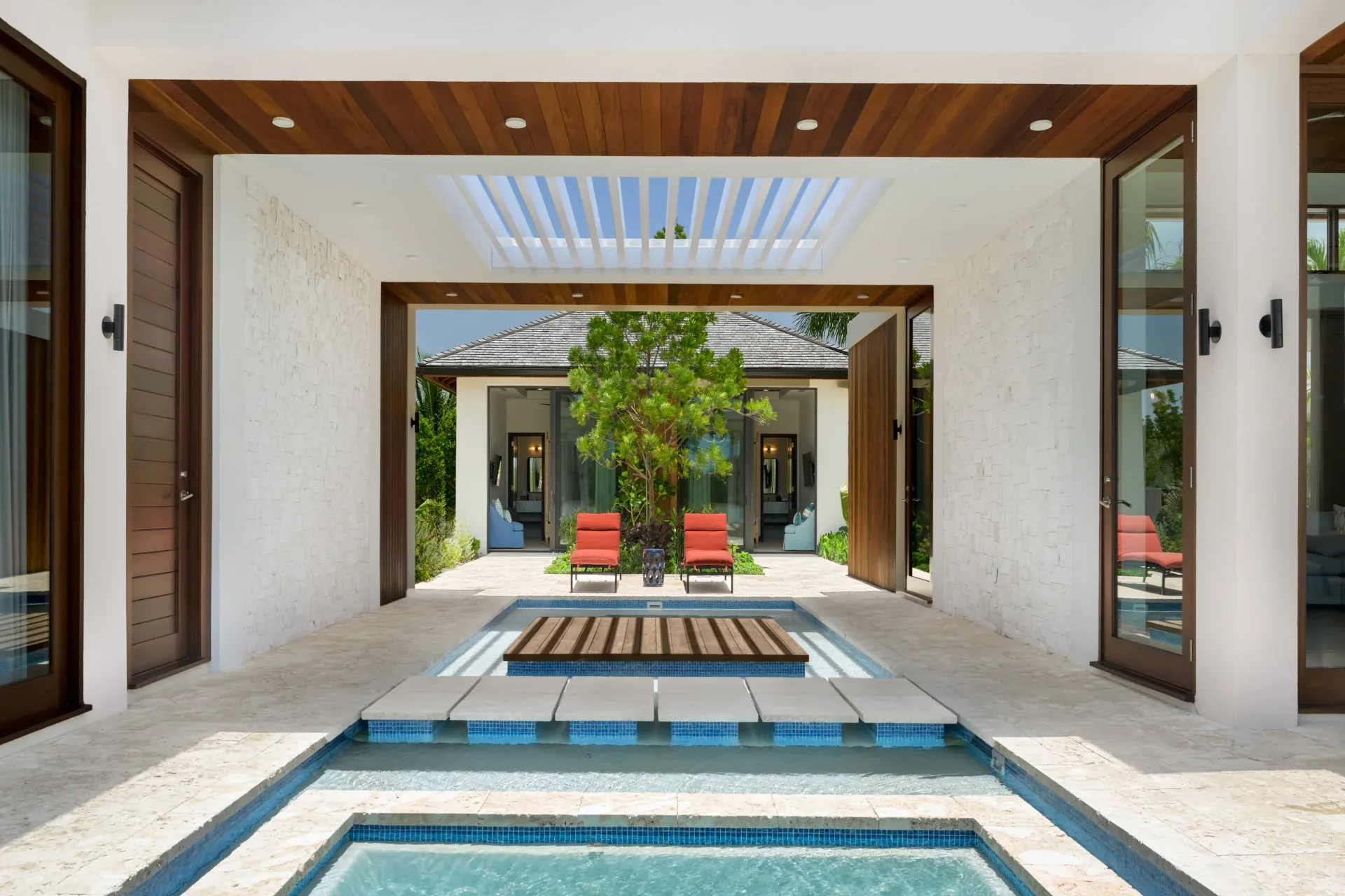 Inside, vaulted ceilings, warm wooden finishes, and vibrant Caribbean textiles create a welcoming atmosphere. The six suites are thoughtfully spread out to ensure privacy. Three are located in the main house—two with king beds and one with twins—while two additional king suites are situated across the pool. The master suite enjoys its own building with canal views, a private terrace, and an expansive indoor-outdoor bathroom.