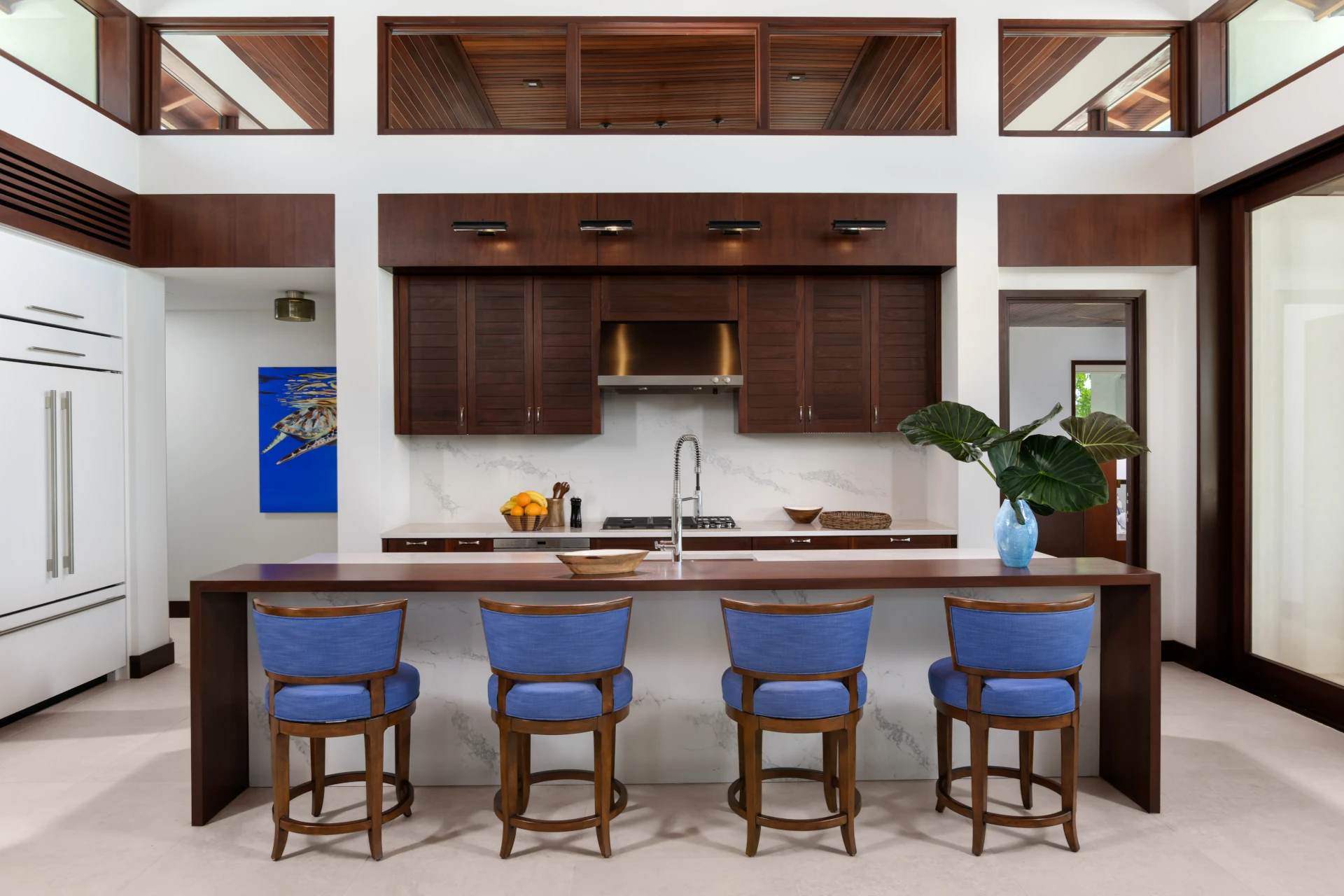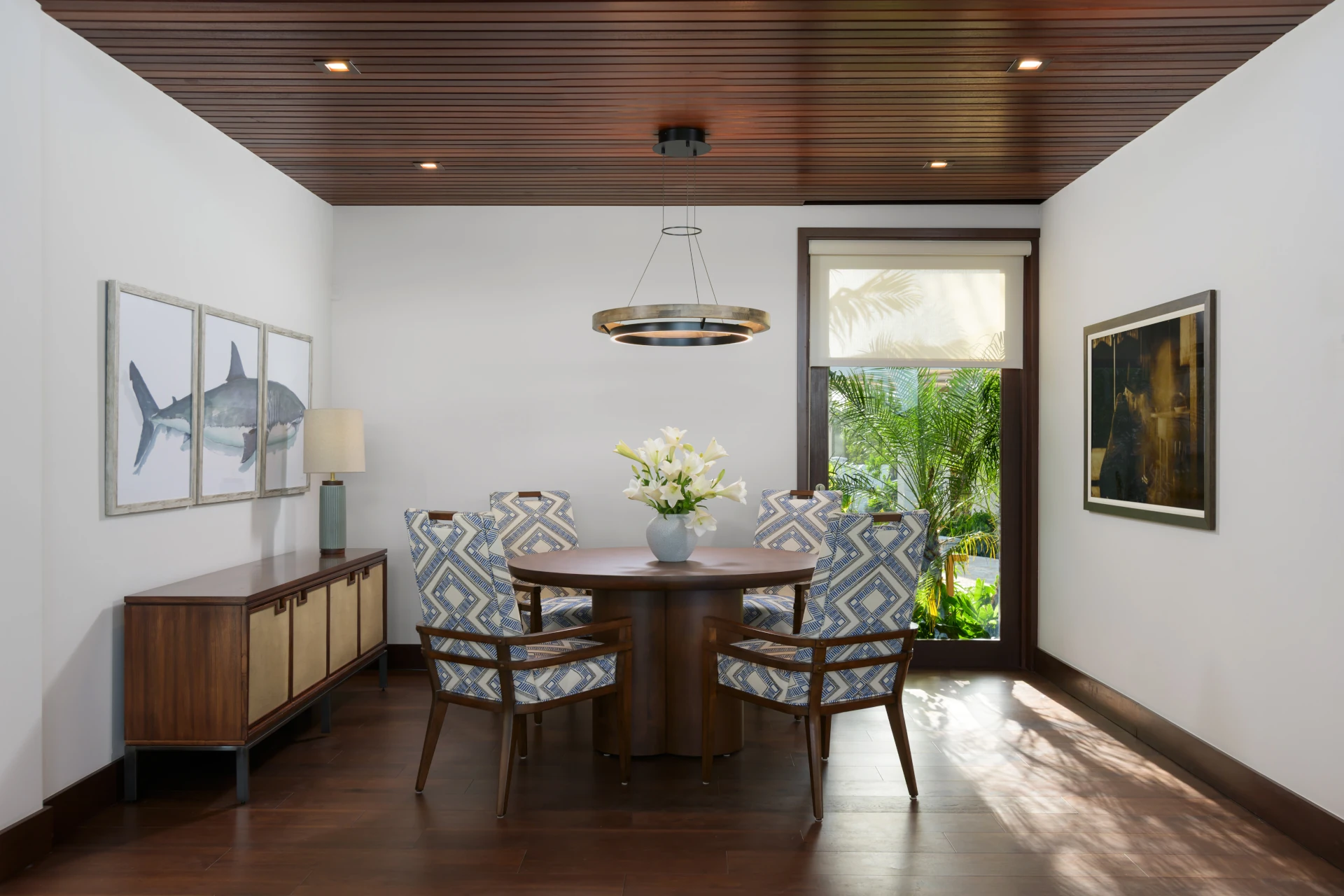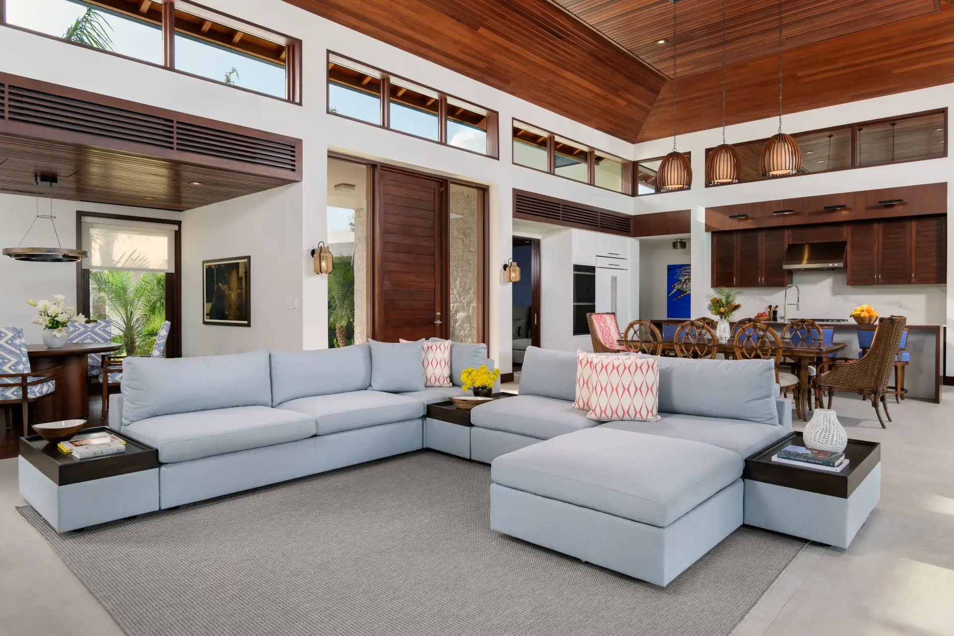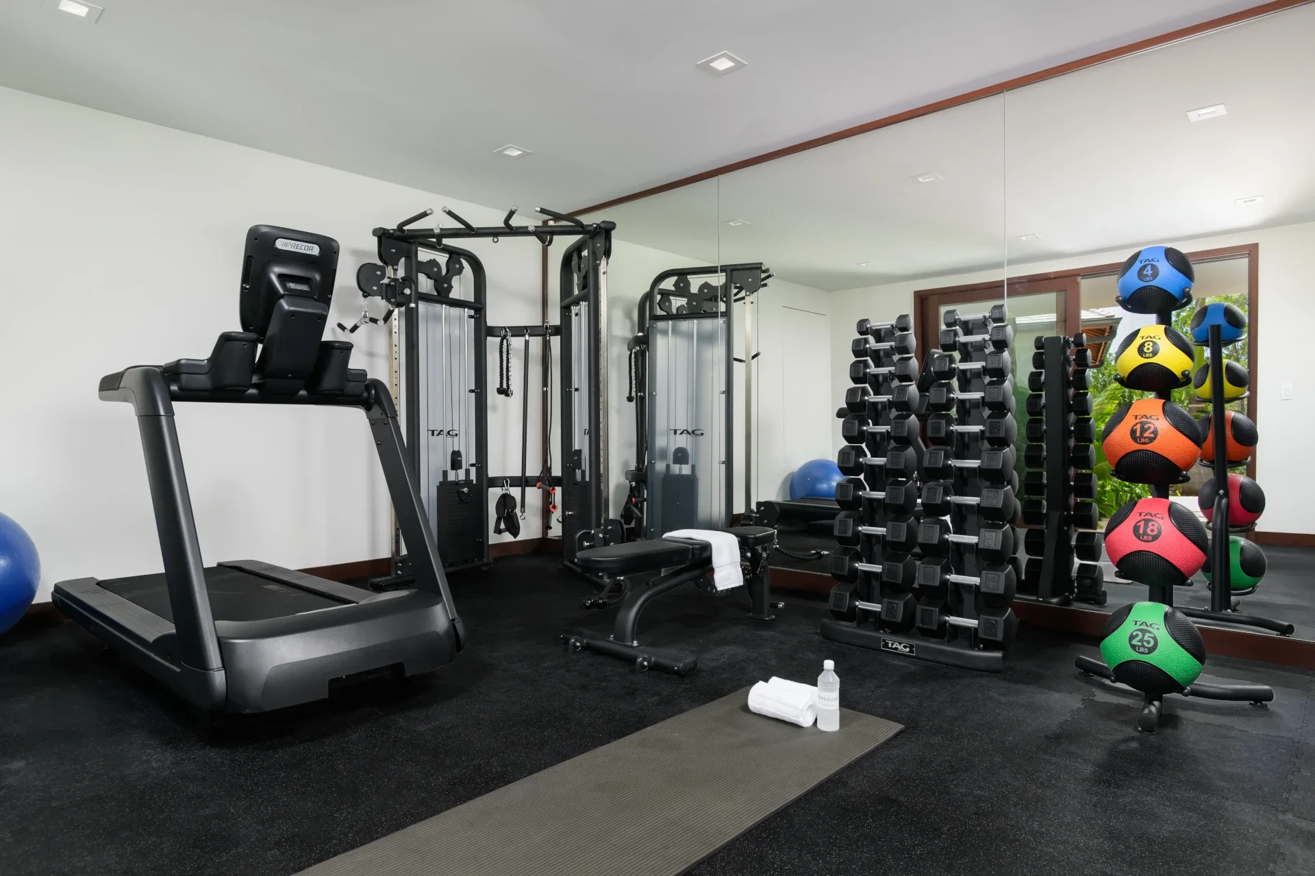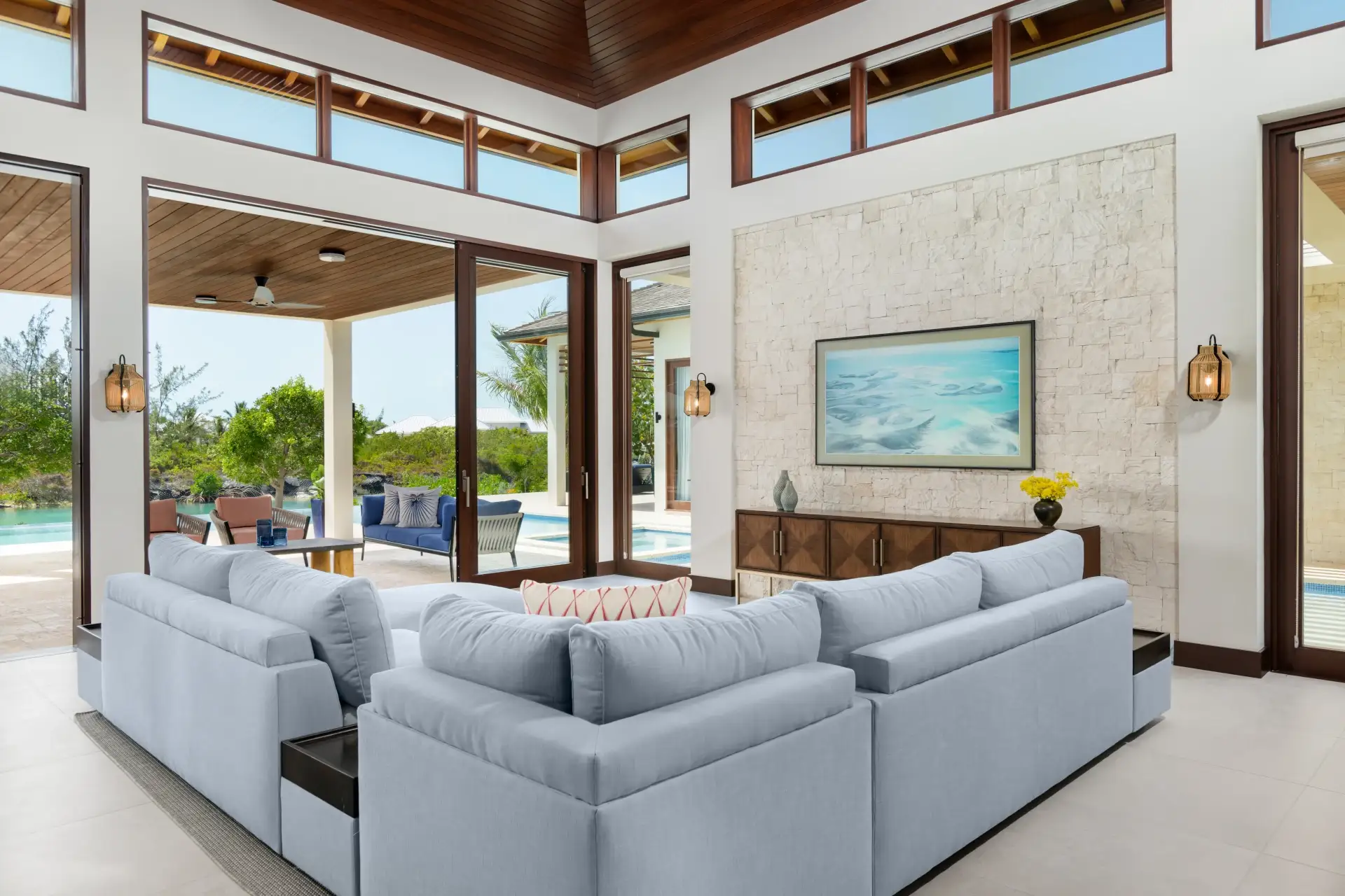 The great room combines a modern kitchen, dining area, lounge, and a game den, all flowing seamlessly out to the pool deck. For those who wish to keep active during their stay, the villa also includes a fully-equipped private gym.