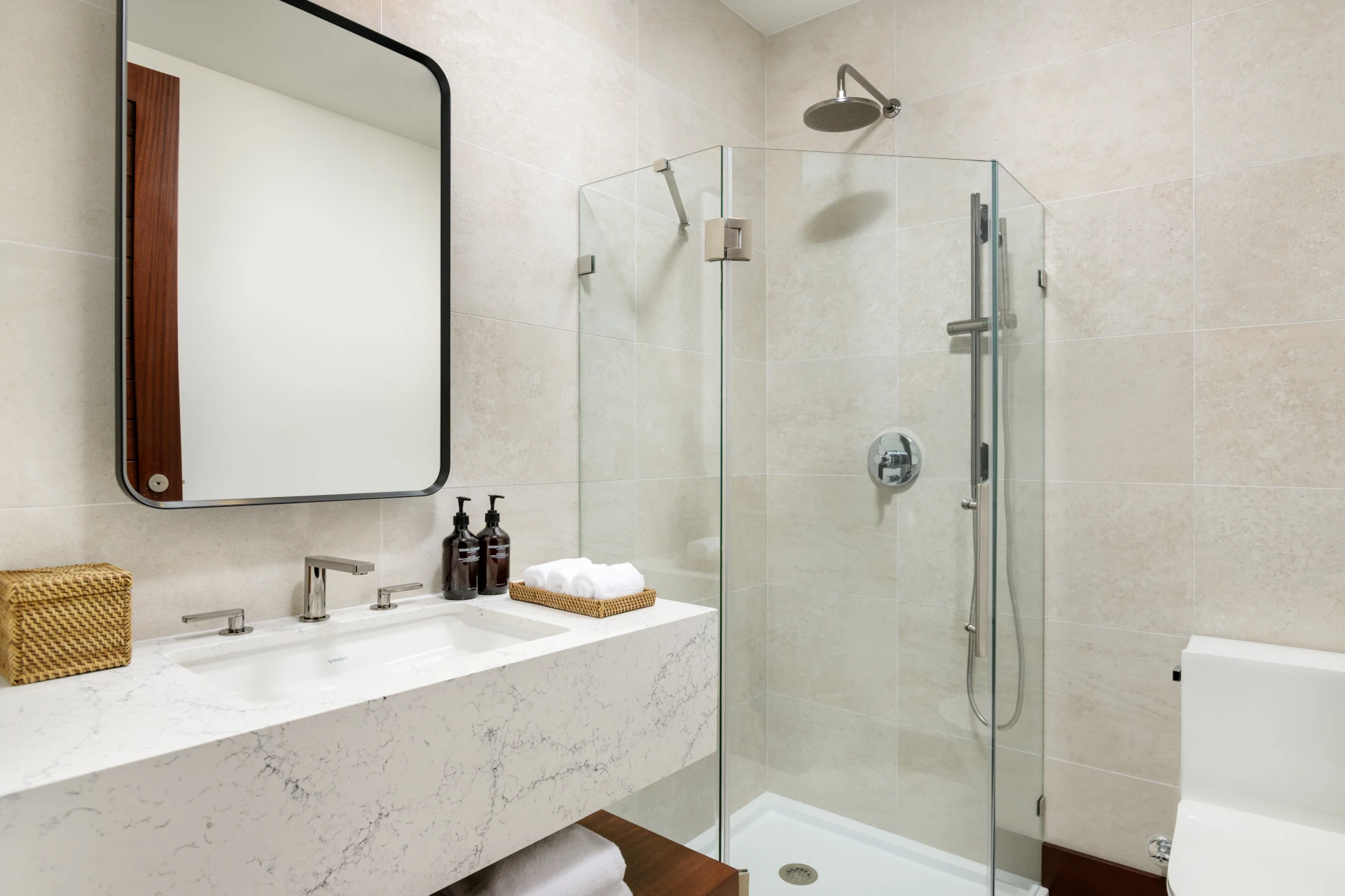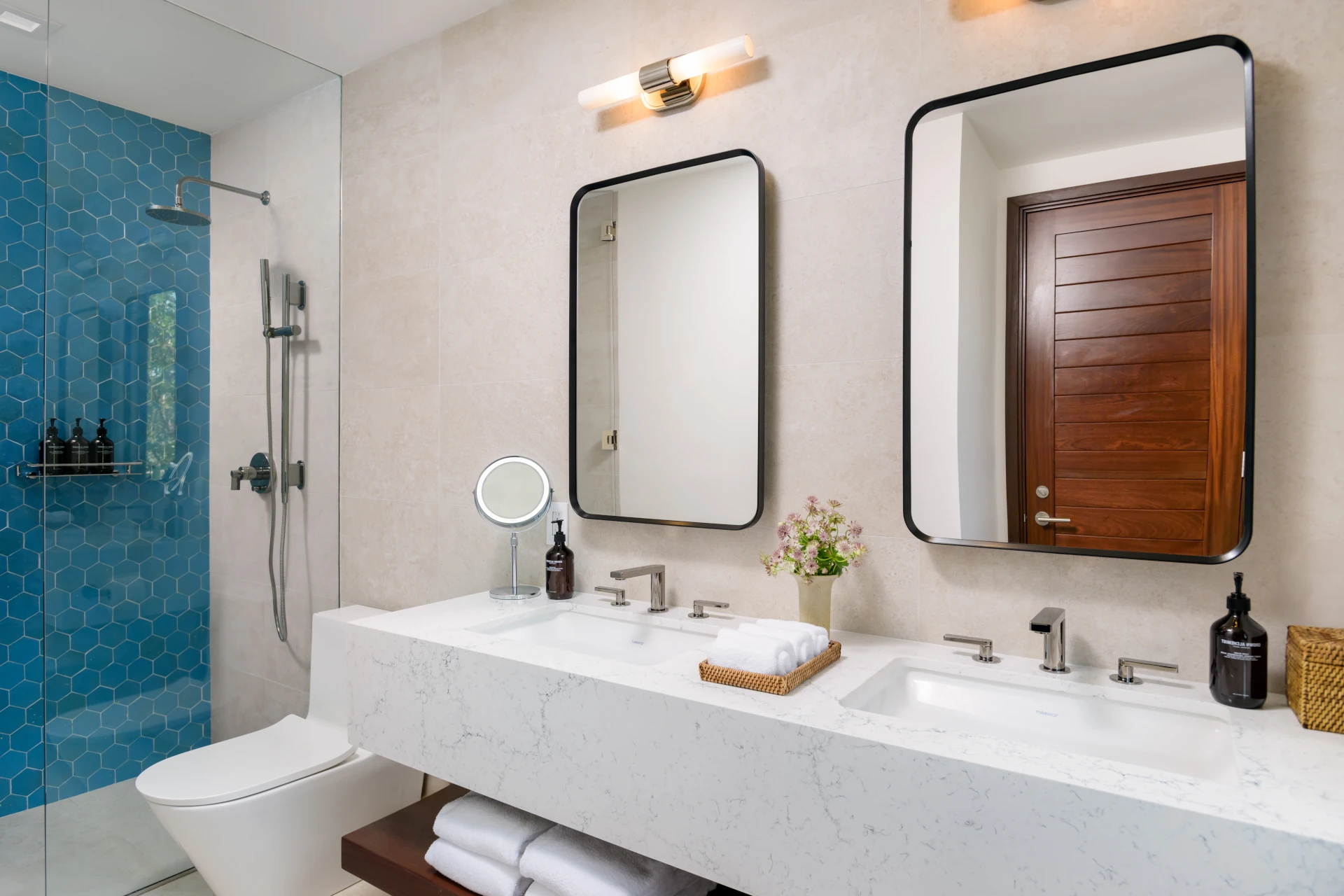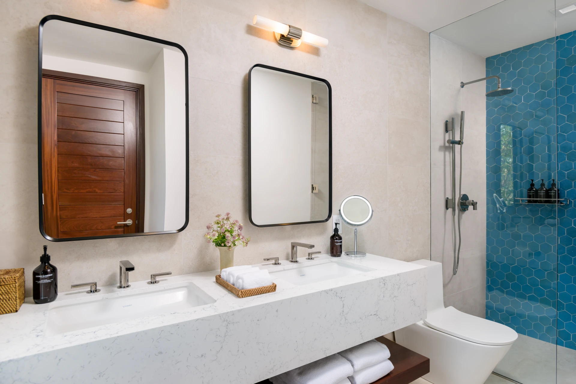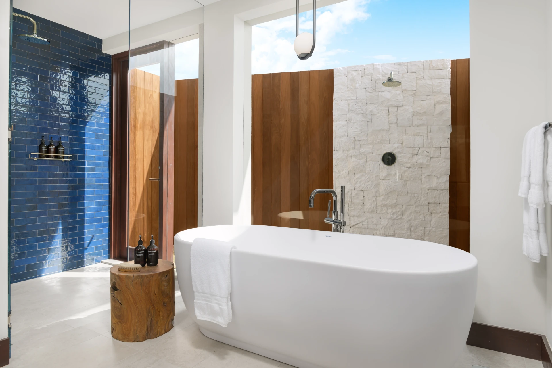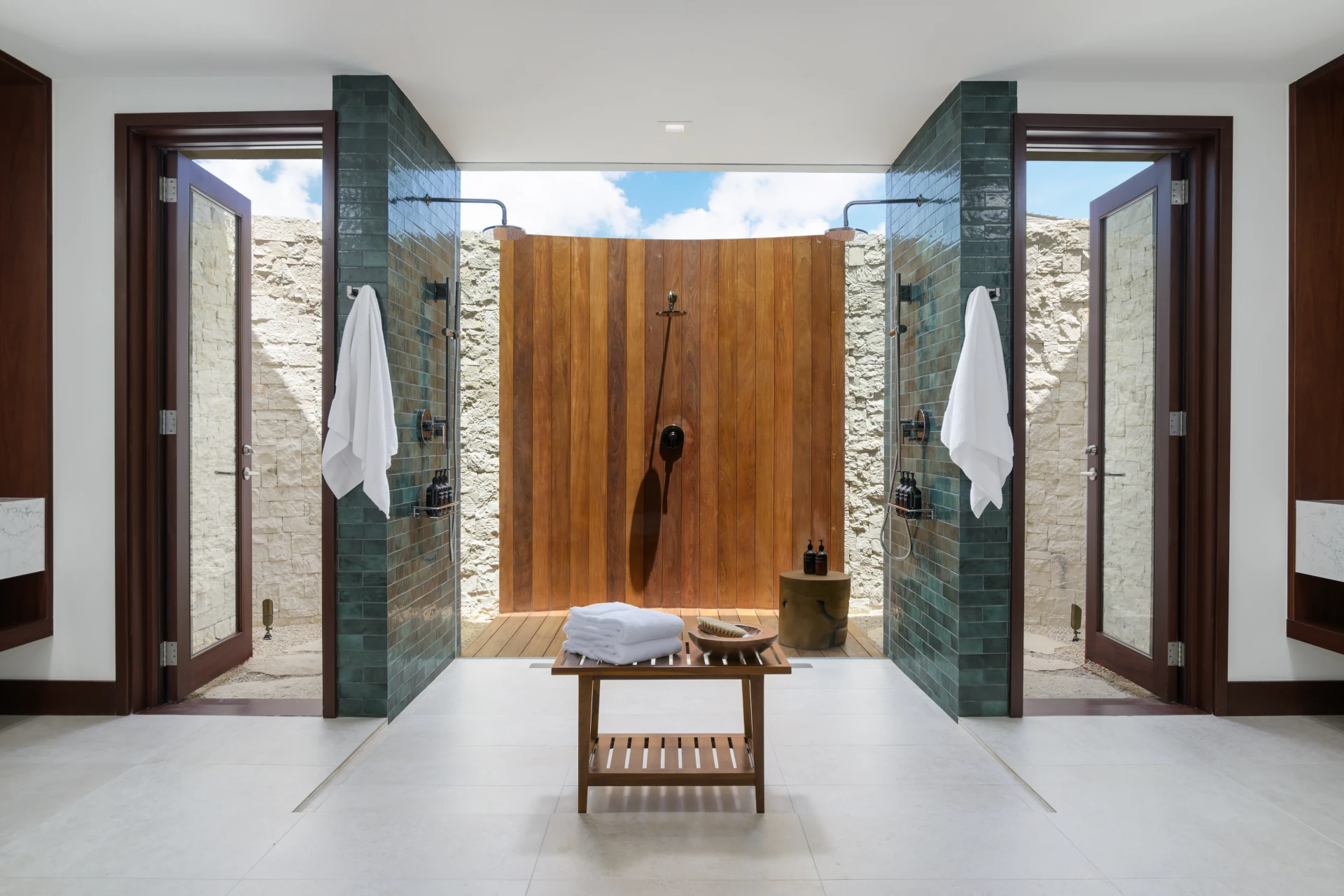 The great room combines a modern kitchen, dining area, lounge, and a game den, all flowing seamlessly out to the pool deck. For those who wish to keep active during their stay, the villa also includes a fully-equipped private gym.