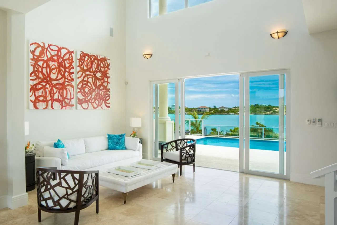The main living room at Villa Sunset Close features tall ceilings and a plush sofa right next to the sliding glass doors. Opening to the pool terrace, sitting here is a great way to enjoy the cooling island breezes in comfort.