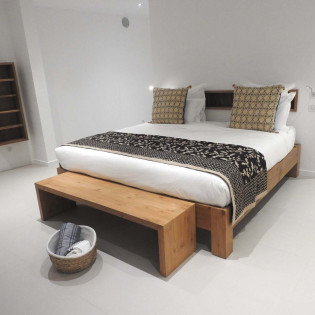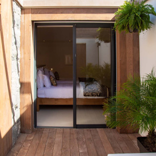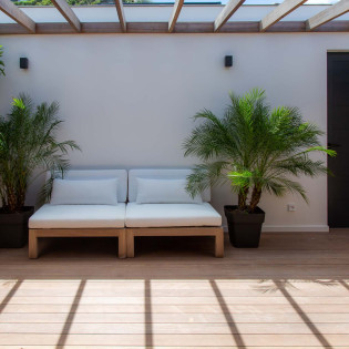 To begin with, the inner courtyard at the entrance to Villa Greenheart is a peaceful and wonderful spot to relax and take in some sun. On the other side, the gorgeous terrace continues with the natural theme, with clean lines and wood creating an earthy, modern space.