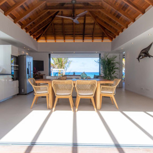 The living spaces of Villa Greenheart take their inspiration from the beachfront location. Simple, effortless, and uncluttered, the large main room is home to the living room, dining area, and kitchen.