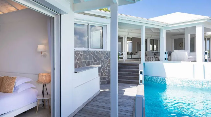 Located in Anse des Cayes with private beach access and minutes from shopping