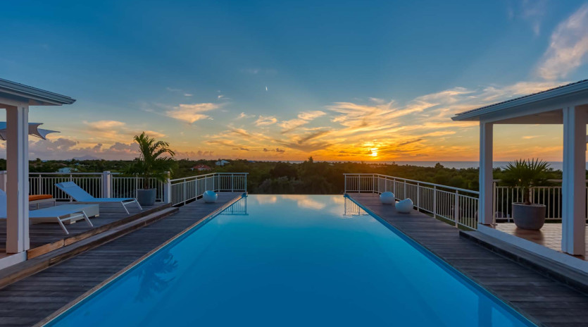 Modern, colorful, spectacular sunsets, ocean, hillside, and surrounding islands views